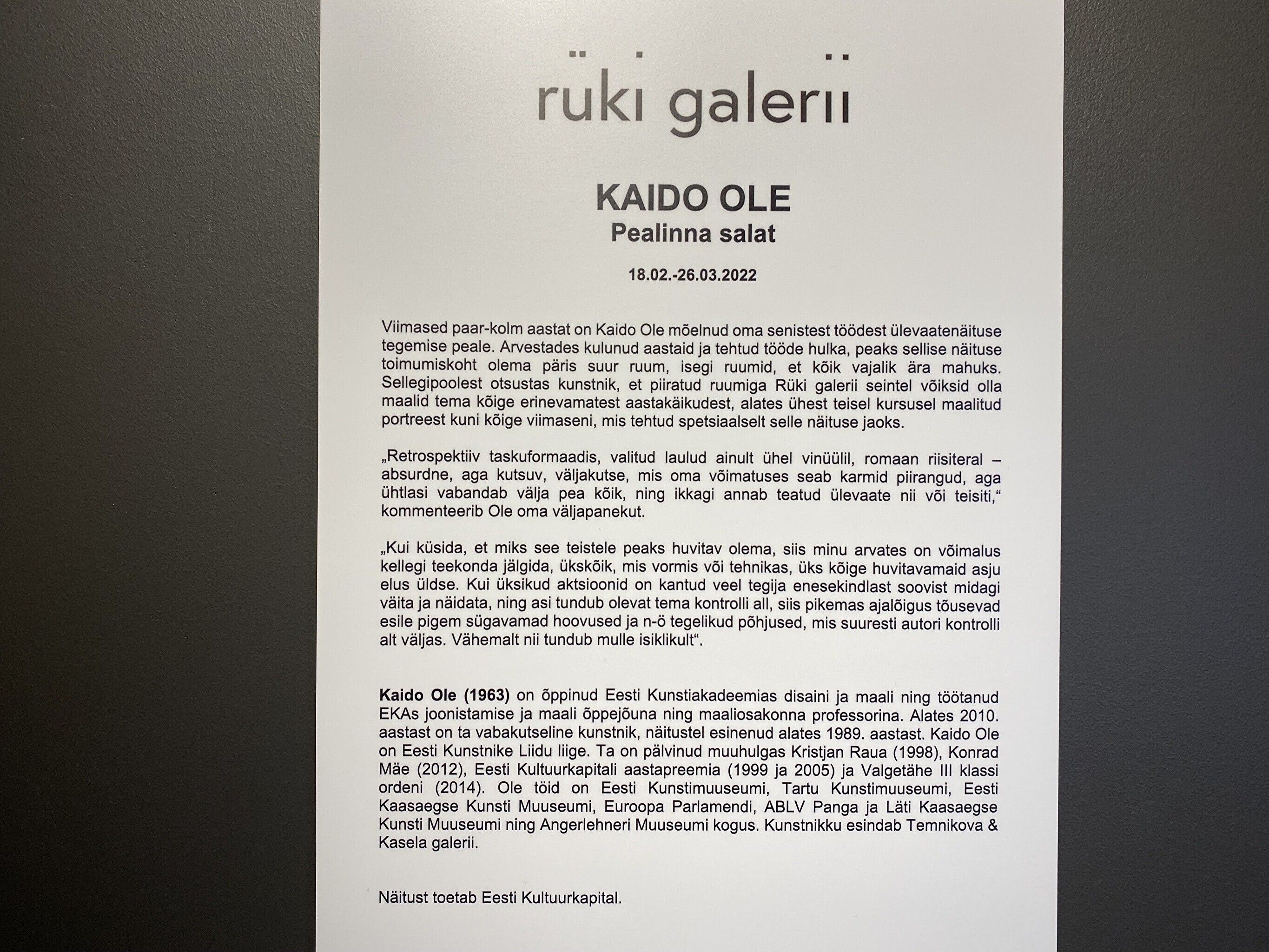 Kaido Ole on senise loomingu retrospektiivile mõelnud paar-kolm aastat. Kuna Rüki galerii väiksus intrigeeris, tegi ta valiku ainult ateljees leidunud töödest.