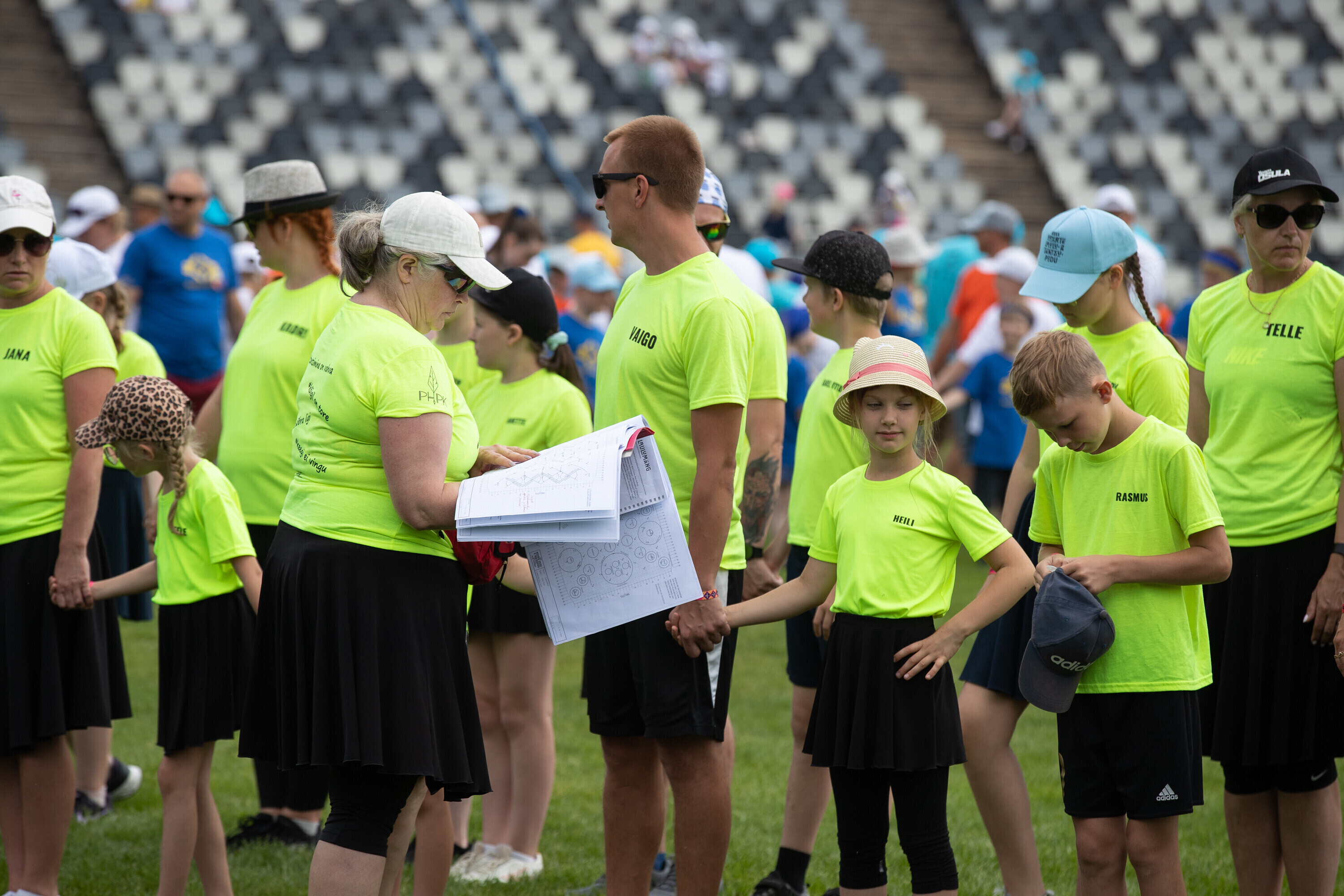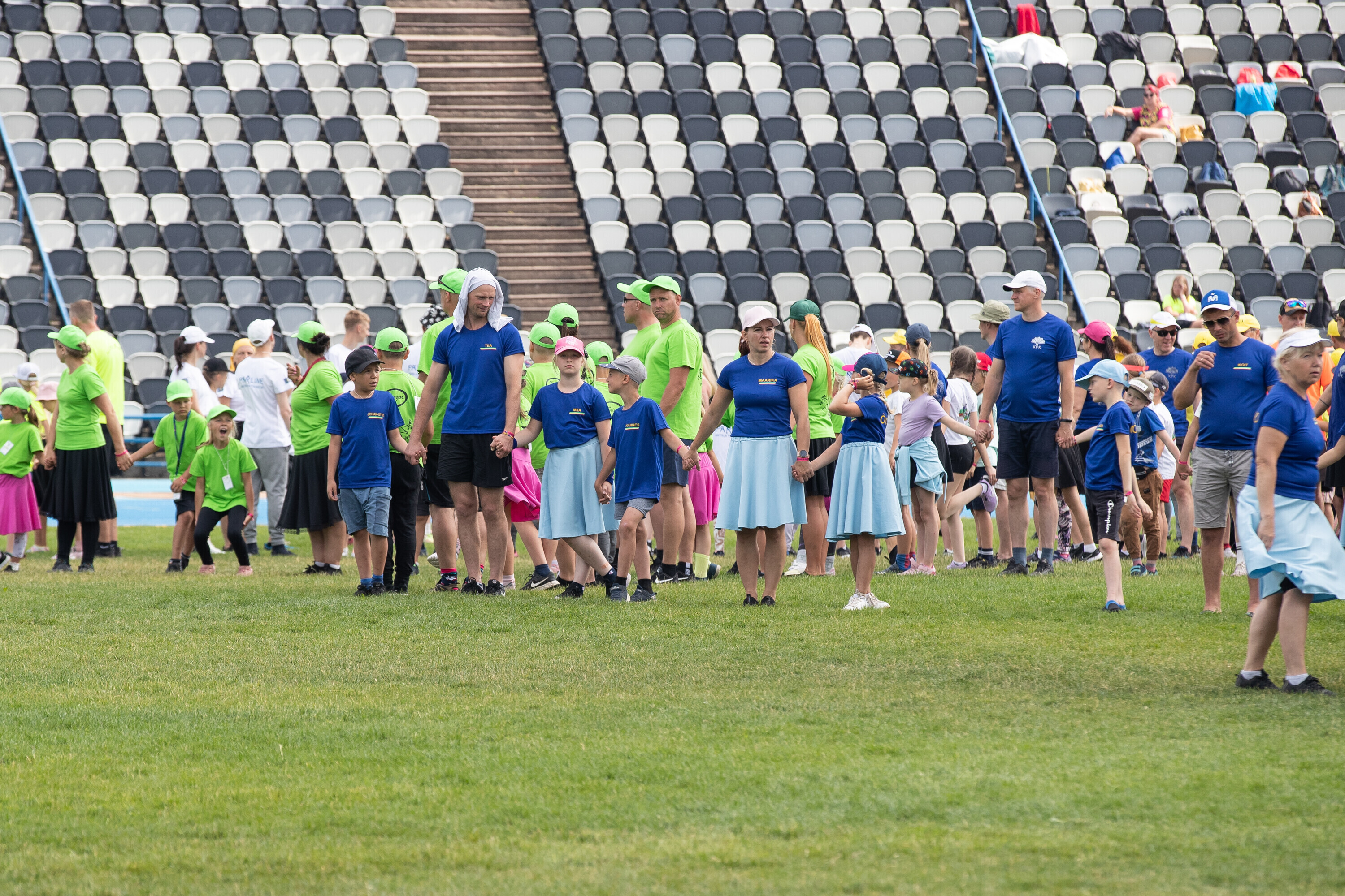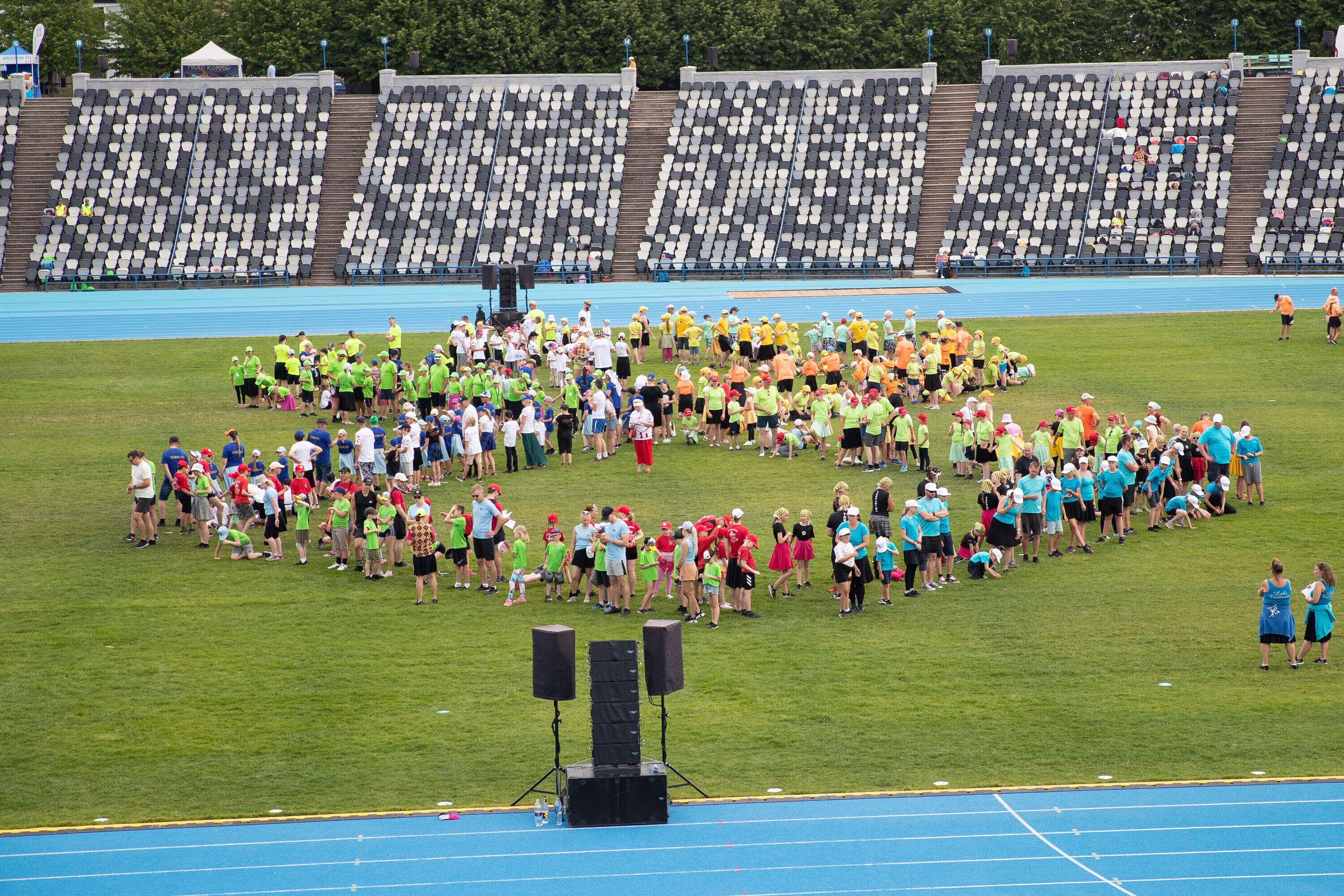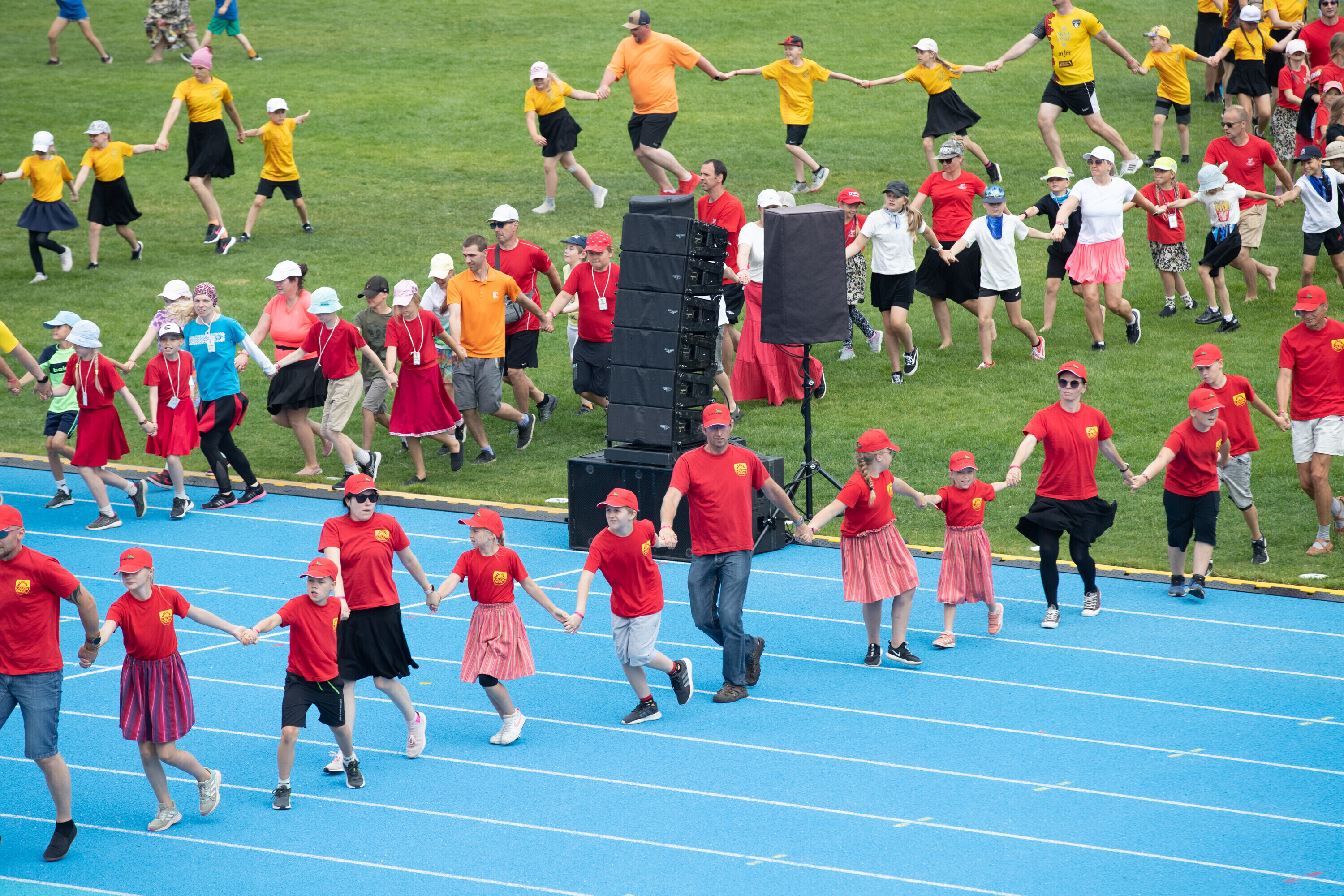 Kalevi peastaadionil algasid nooremate tantsijate proovid. Prooviplatsil on paigas rühmad, keda koordineerib kõlaritest tantsujuht. Juhi kõrval on kaardiga assistent. Tantsijatel on platsil abiks assistendid, juhendajad ja maas olevad numbrimärgid ja knopkad. Rühmi juhendatakse platsil nimepidi, proovides kuuleb näiteks nimesid nagu Pärliine, Vana-Vigala, Mürakaru, Kaktus.
