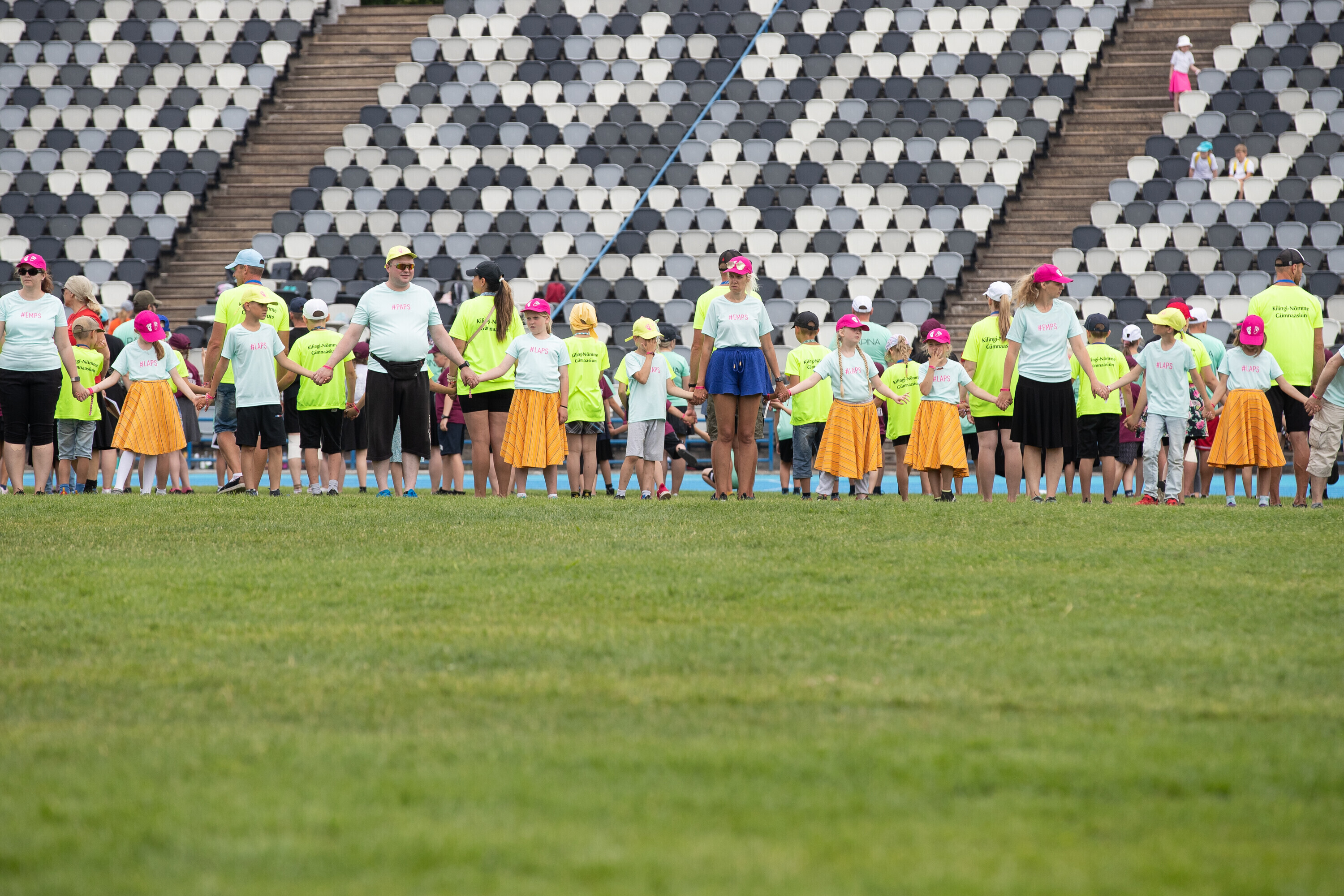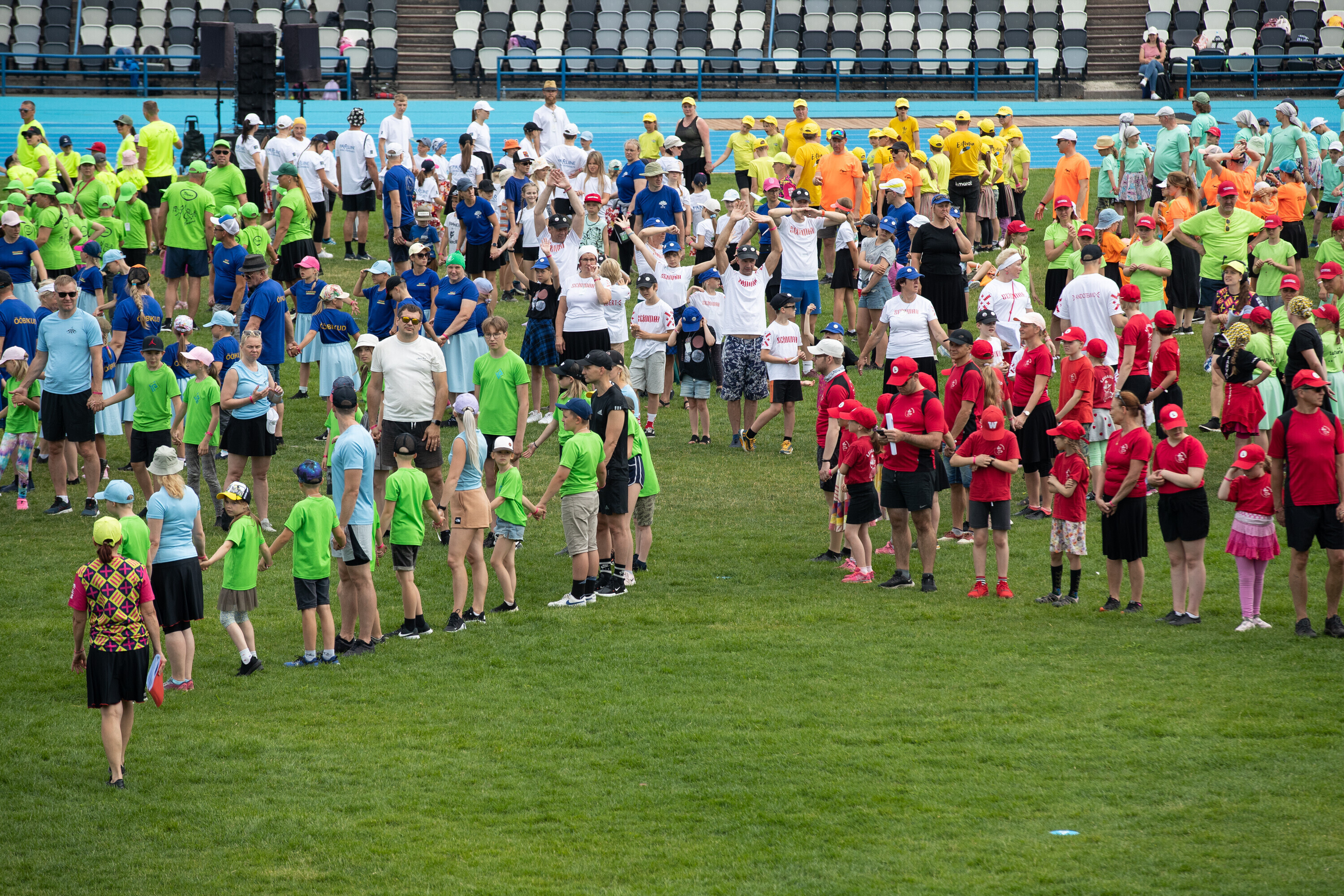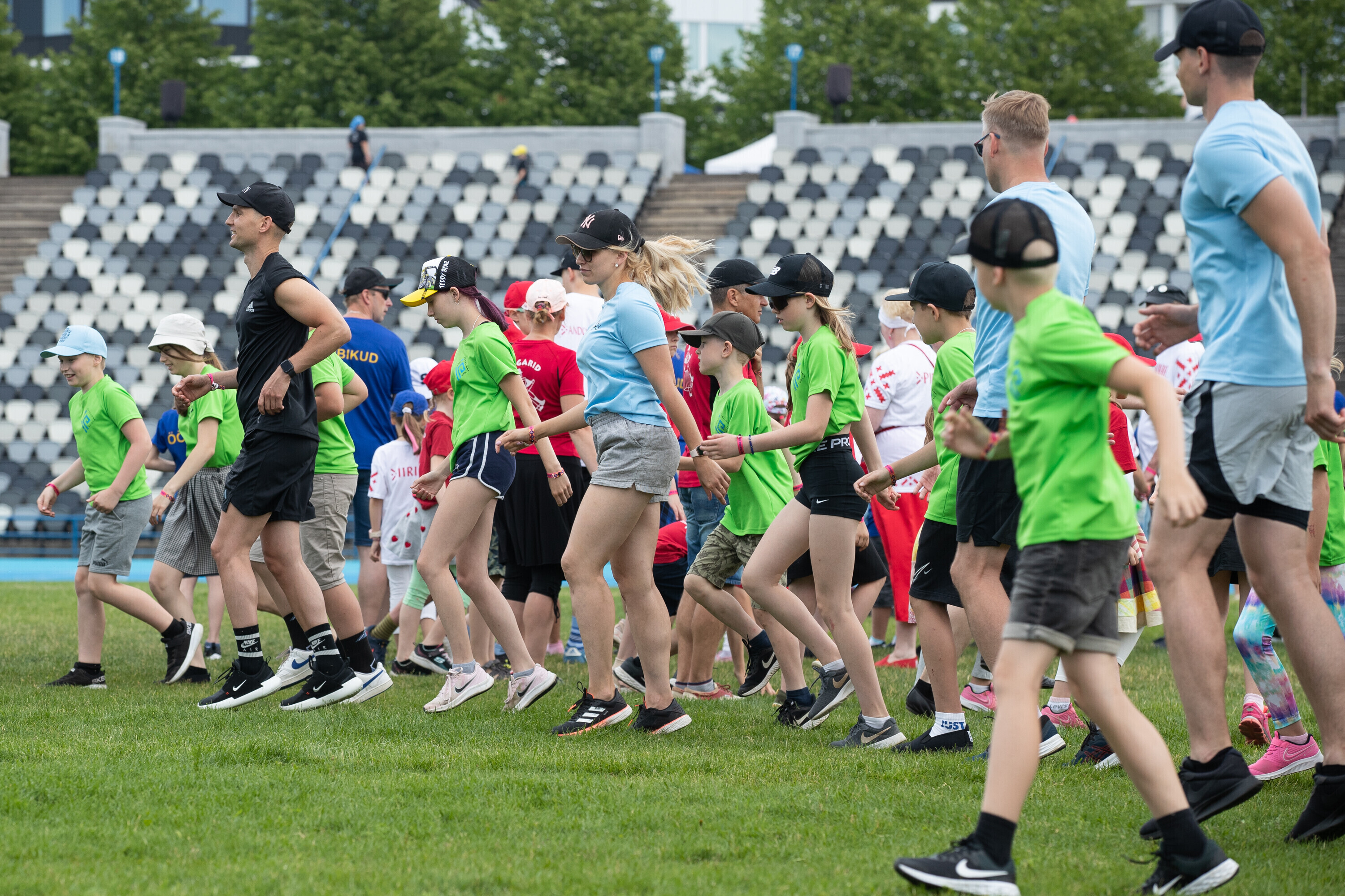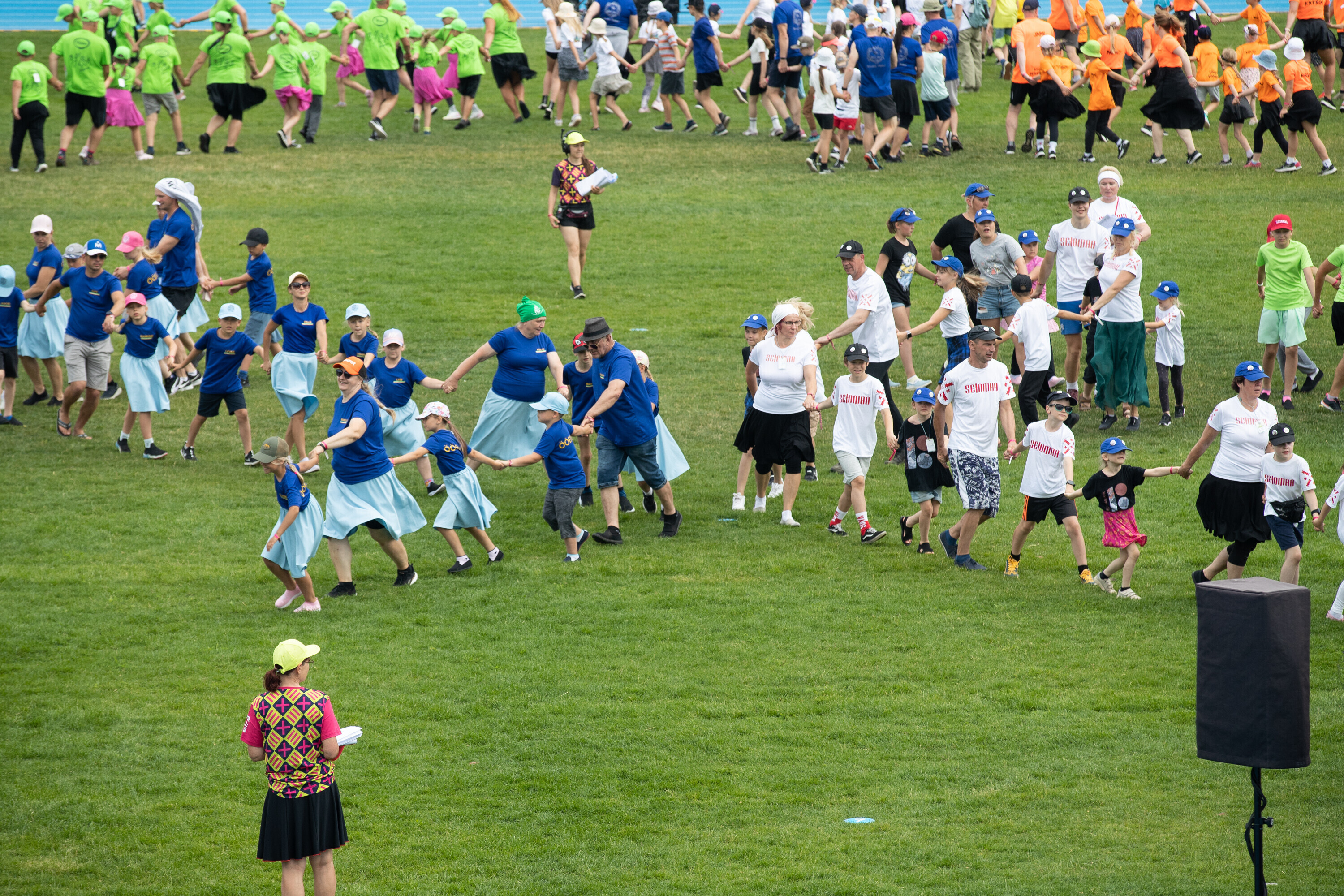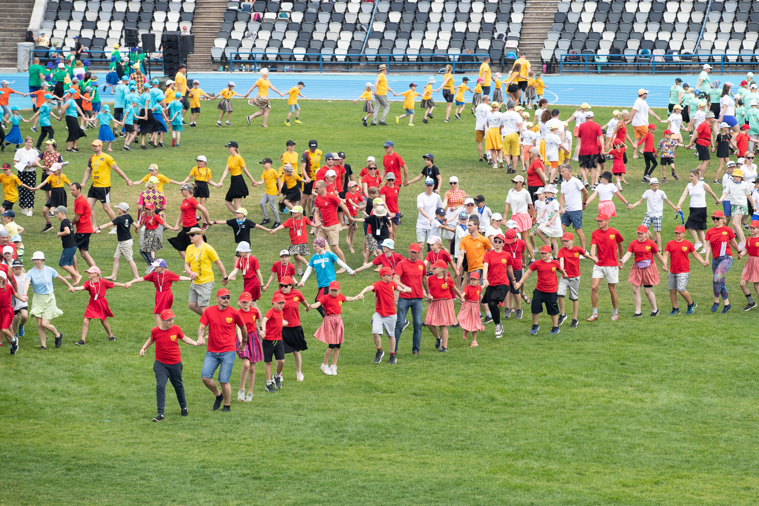 Kalevi peastaadionil algasid nooremate tantsijate proovid. Prooviplatsil on paigas rühmad, keda koordineerib kõlaritest tantsujuht. Juhi kõrval on kaardiga assistent. Tantsijatel on platsil abiks assistendid, juhendajad ja maas olevad numbrimärgid ja knopkad. Rühmi juhendatakse platsil nimepidi, proovides kuuleb näiteks nimesid nagu Pärliine, Vana-Vigala, Mürakaru, Kaktus.