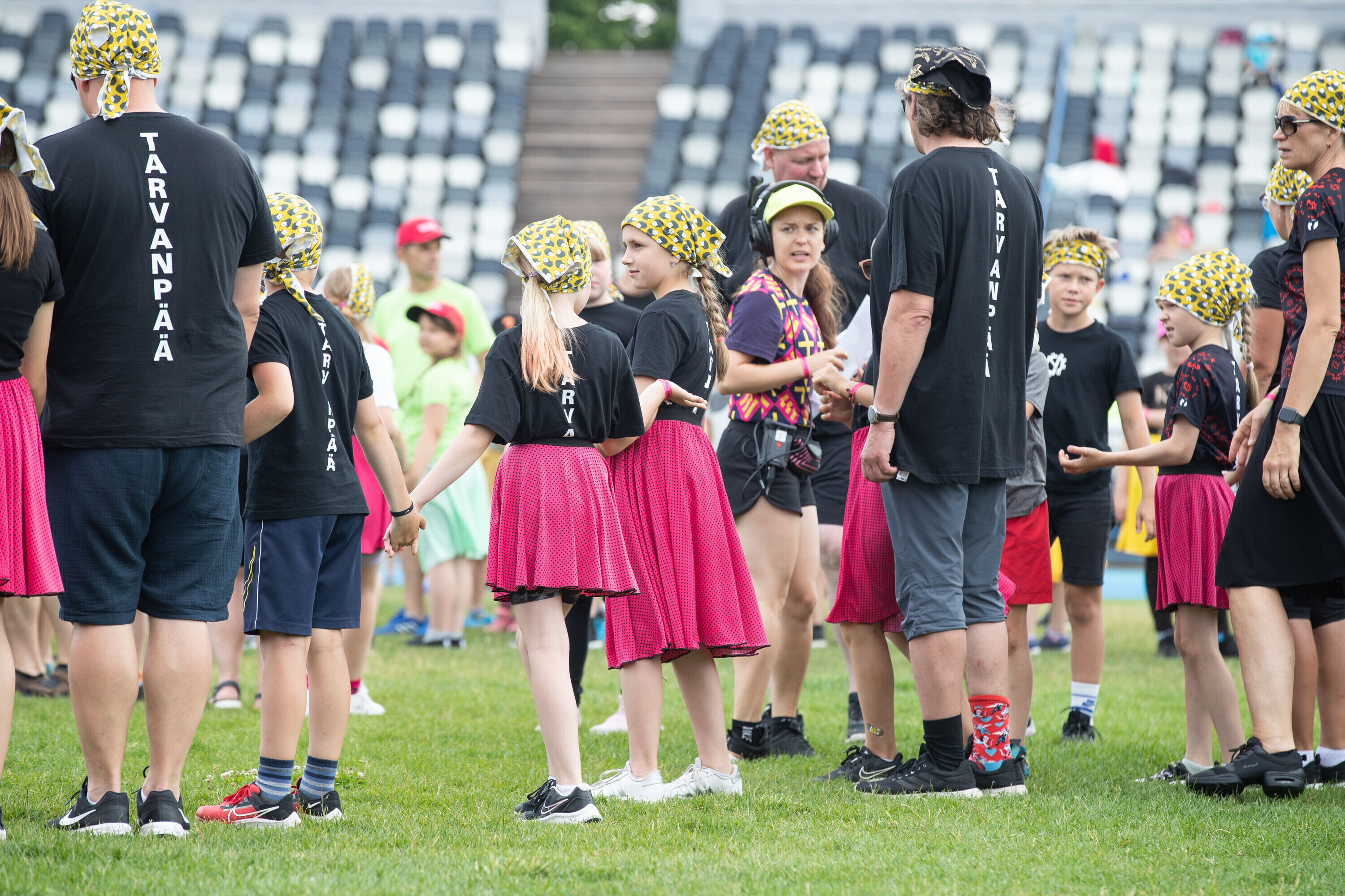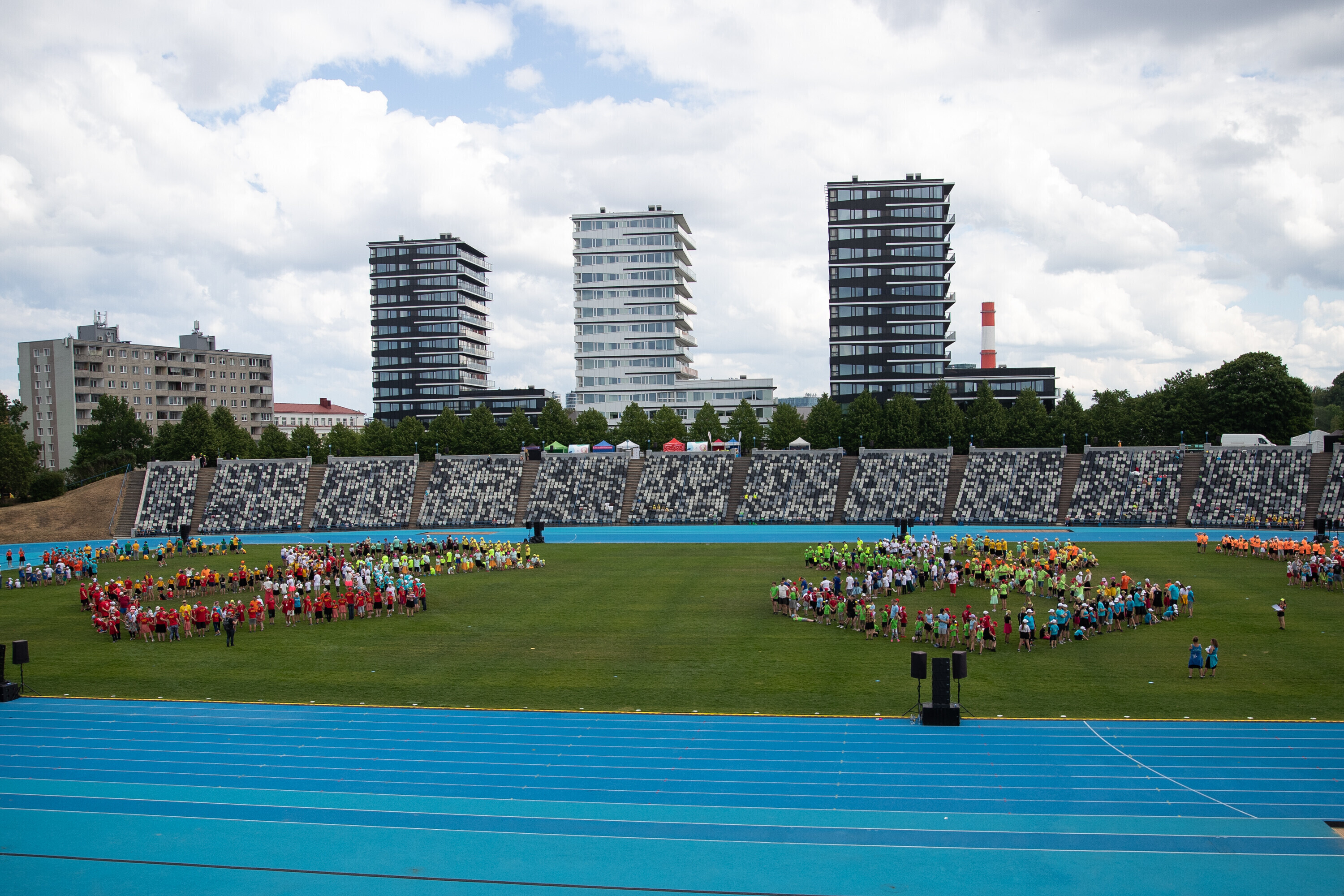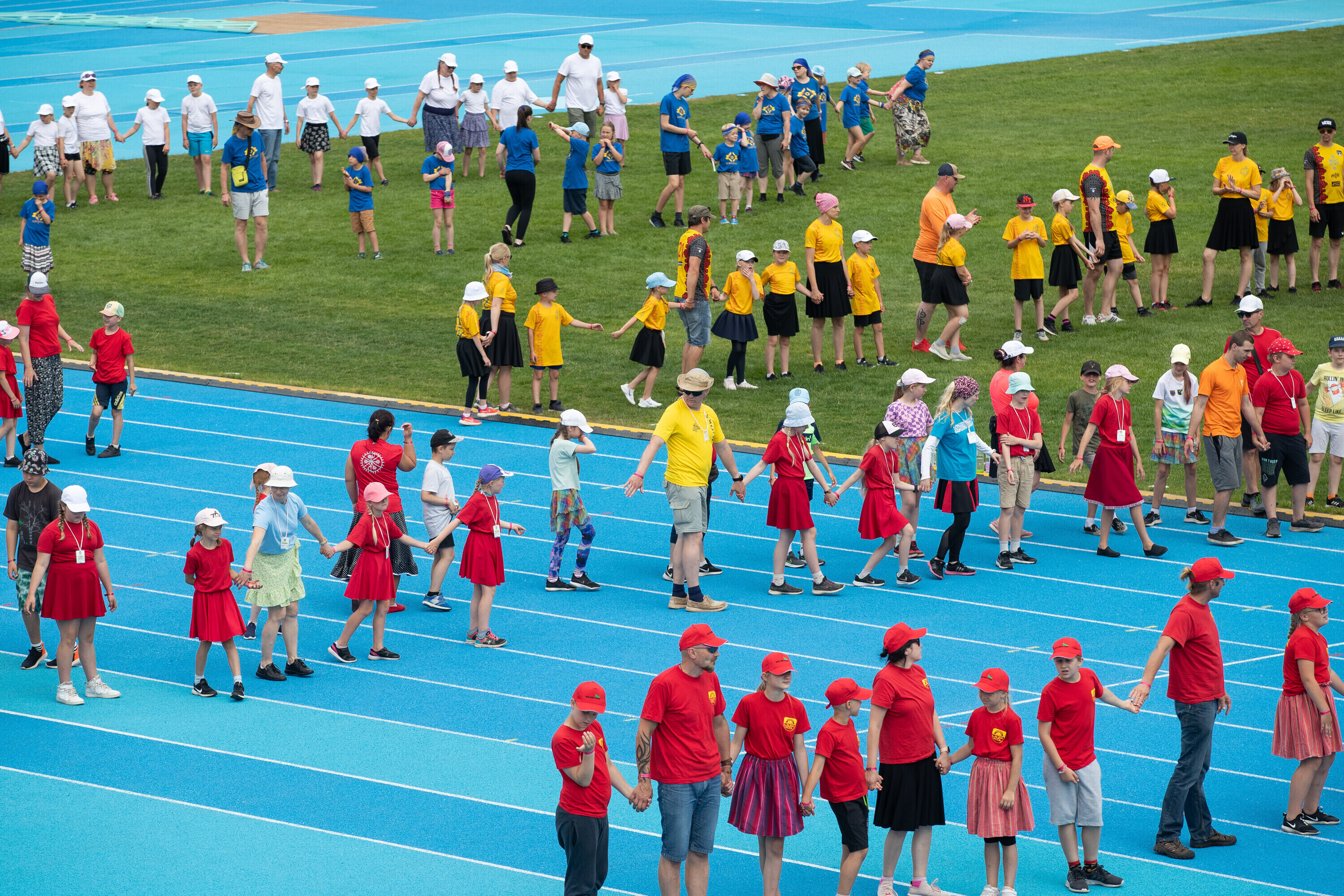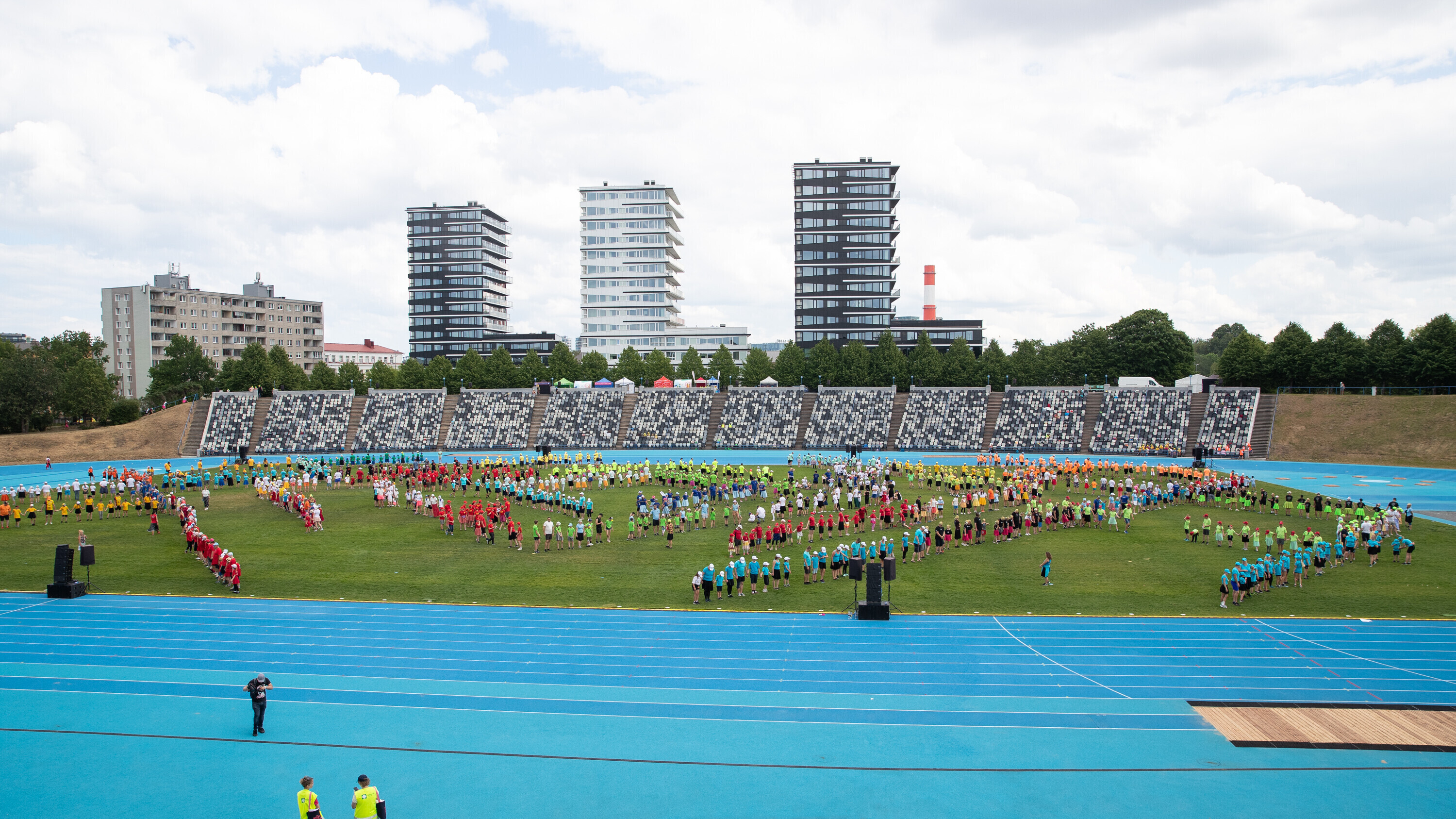 Kalevi peastaadionil algasid nooremate tantsijate proovid. Prooviplatsil on paigas rühmad, keda koordineerib kõlaritest tantsujuht. Juhi kõrval on kaardiga assistent. Tantsijatel on platsil abiks assistendid, juhendajad ja maas olevad numbrimärgid ja knopkad. Rühmi juhendatakse platsil nimepidi, proovides kuuleb näiteks nimesid nagu Pärliine, Vana-Vigala, Mürakaru, Kaktus.