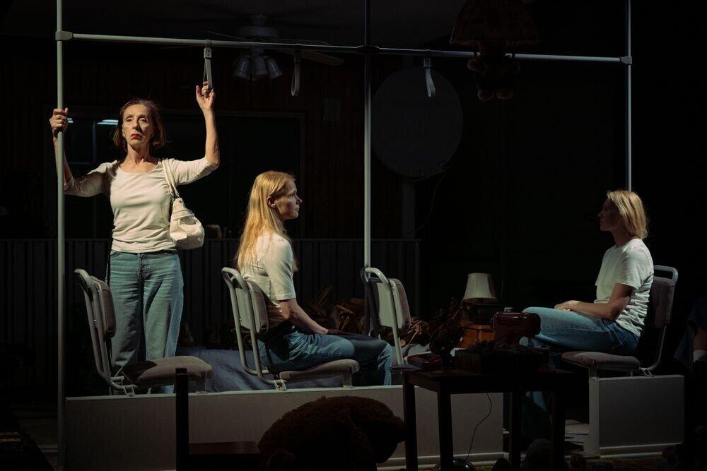 Kõik sama elu vanuselised naisversioonid – kelle mängu loomulikkus oli igati nauditav, nagu ka oodata võis – sattusid keset toimetusi vahepeal metafoorselt "elu käes" lämbumise kätte, justkui aeg ning elu oleks nad kinni püüdnud, seda kõige argisematel hetkedel, oma kodus toimetades, bussis… ja lämbusidki, keegi ei teinud märkama, kuni hingamine lõppes. Aga raadioeeter jätkas seletamist, sest kunagi ei lõppenud ega lõppegi otsa inimesed, kes ühisesse tühjusesse hüüdes kuuldud ja kuulatud saada püüavad. Kes neist on isehakanud maailmaparandajad, kes satuvad eetrisse saades oma hääle kahestumisest segadusse ning jäävadki eetris iseennast teretama. Muusikat kuuleb samuti, Sabrina Carpenter ja Mati Nuude samas maailmas, ikka ängi või veiniklaasi-ekstaasi kõrvale, kuidas kellelegi.