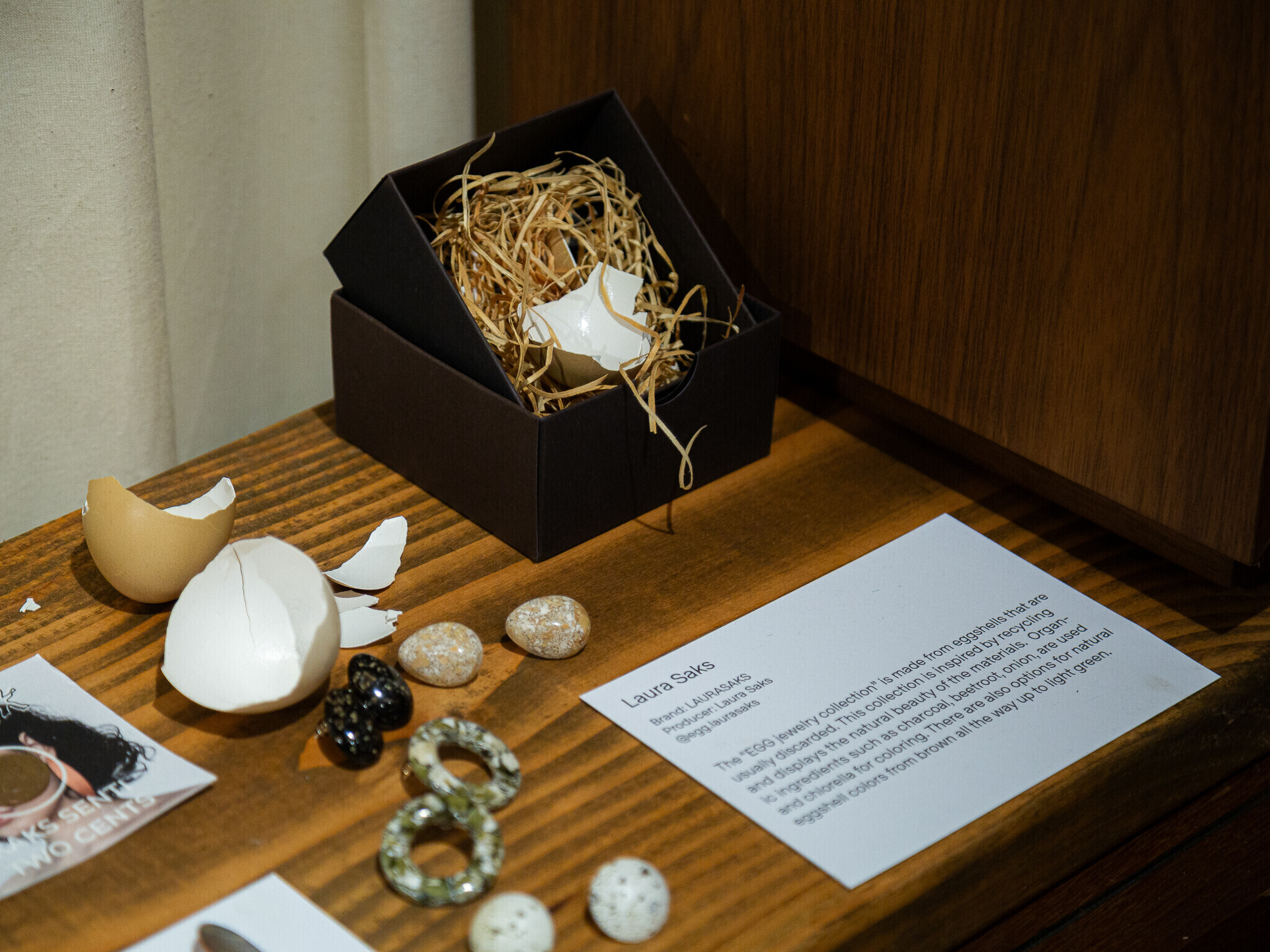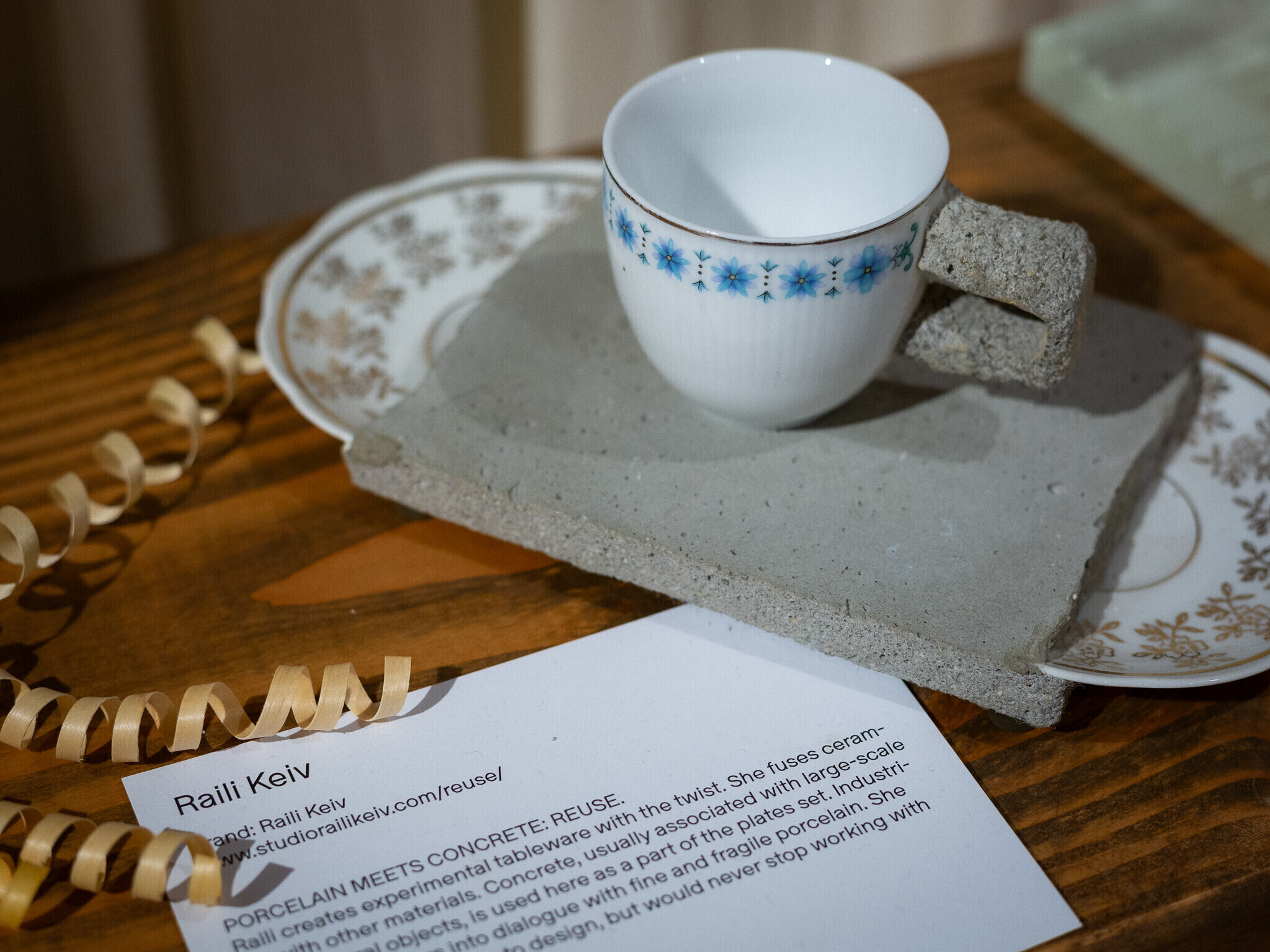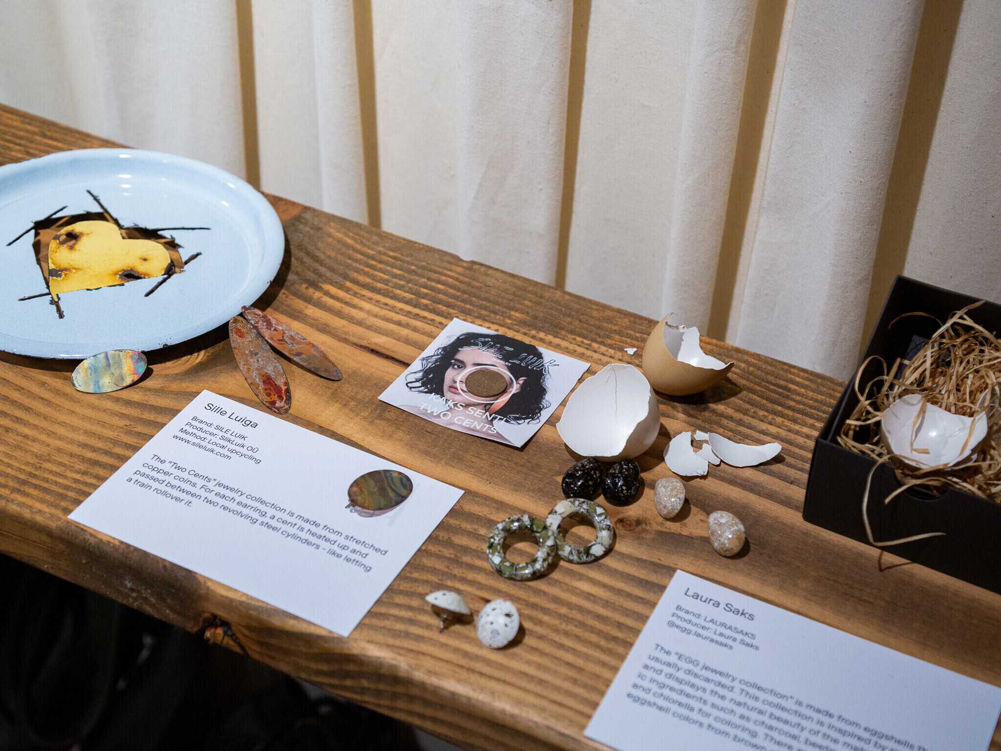 Näitusel on väljas Angela Orgusaare purunenud autoklaasist ehted, Urmas Lüüsi nõukaaegsetest emailpottidest prossid, Laura Saksi munakoortest kõrvarõngad ja Sandra Luksi teksapitsist rõivad, WOH tekstiilijäätmetest riidepuud, Raili Keivi betoonist ja portselanist lauanõud.