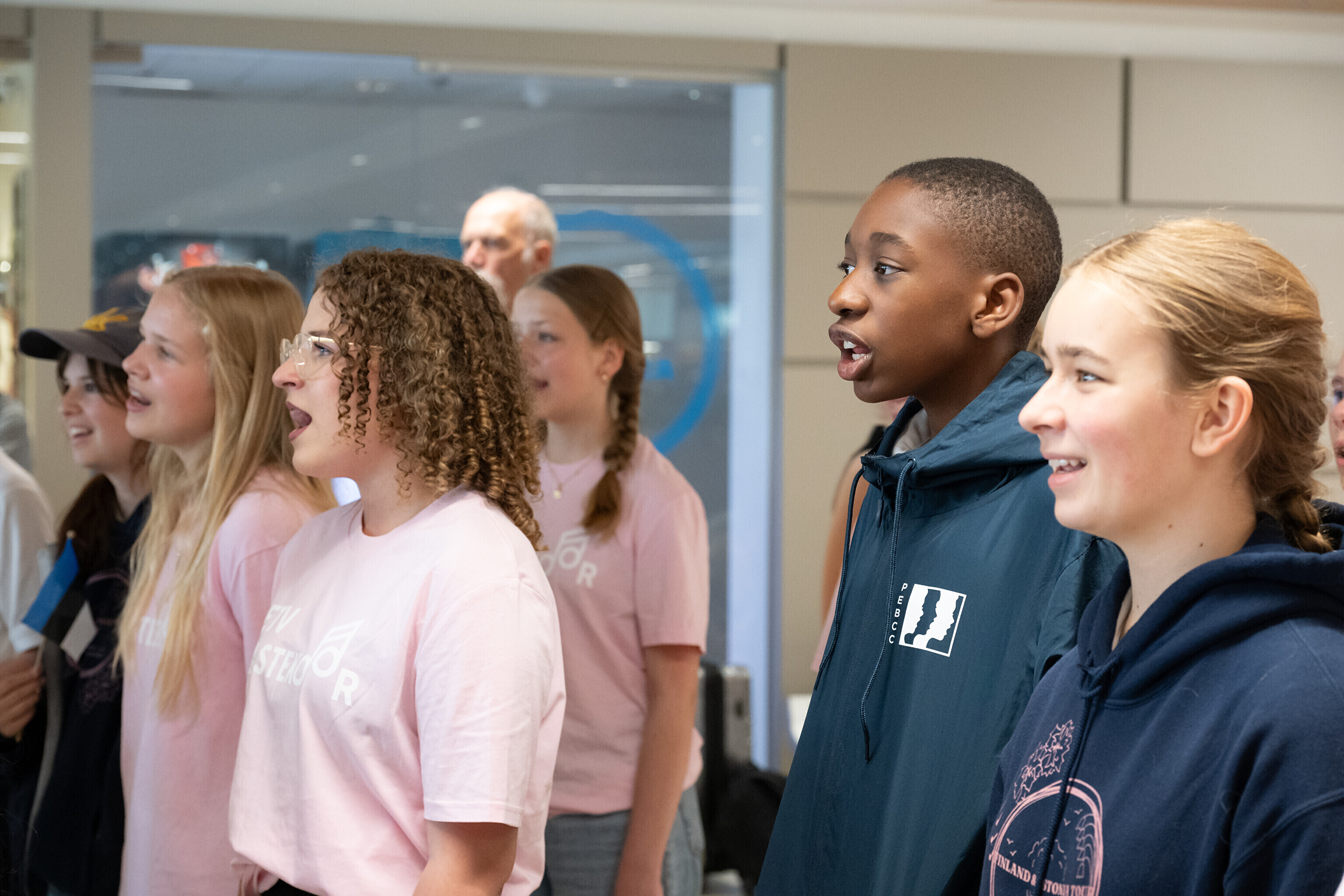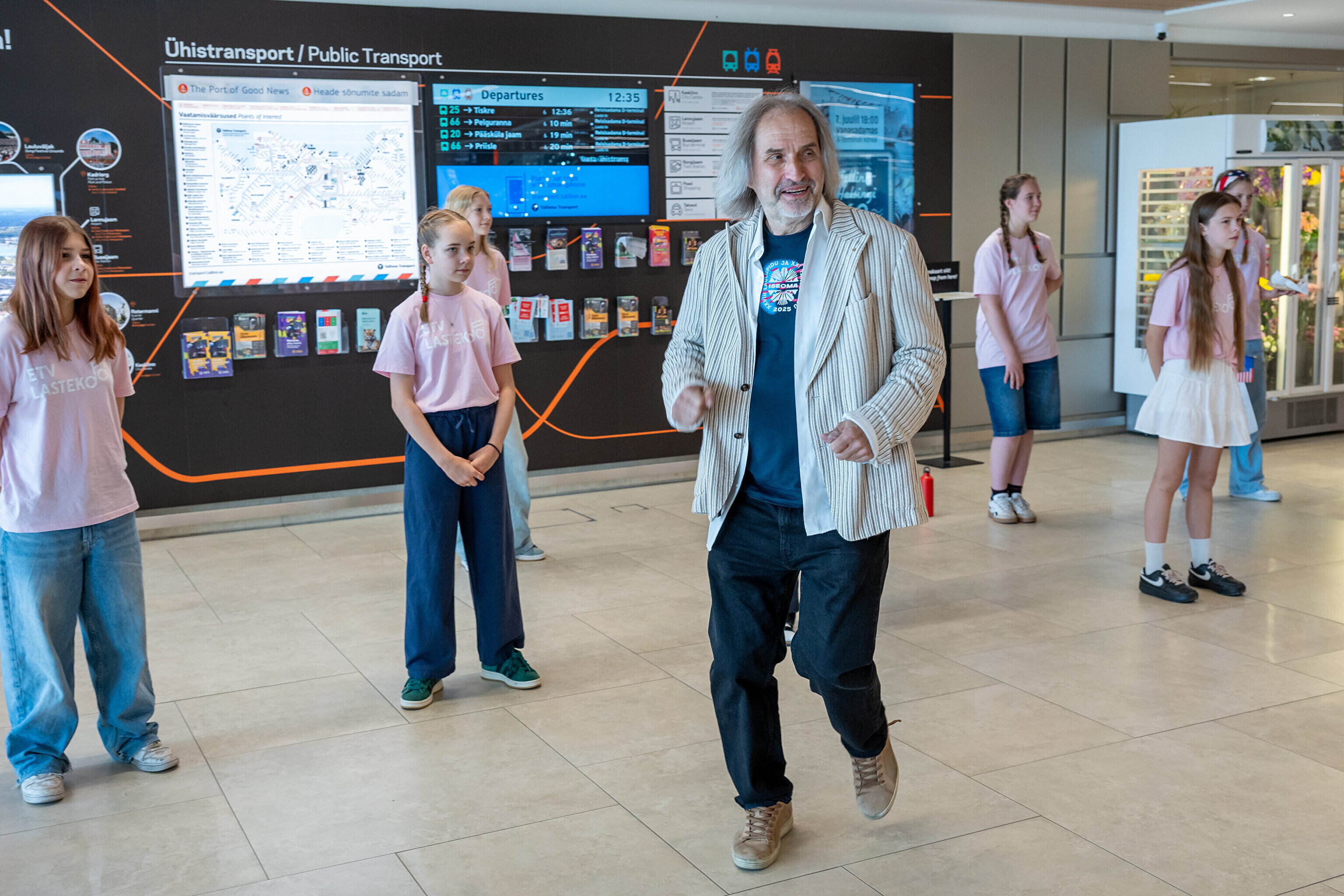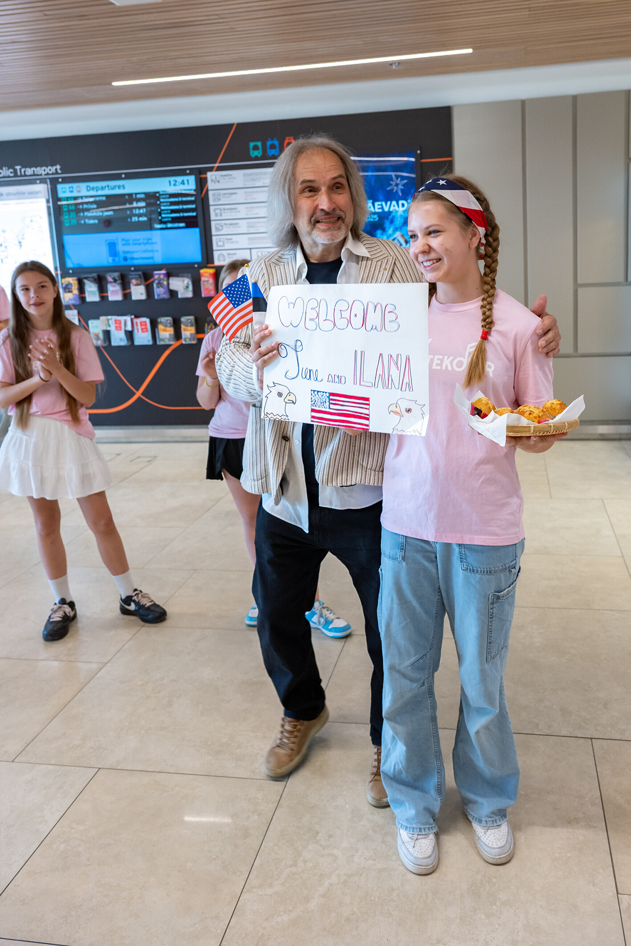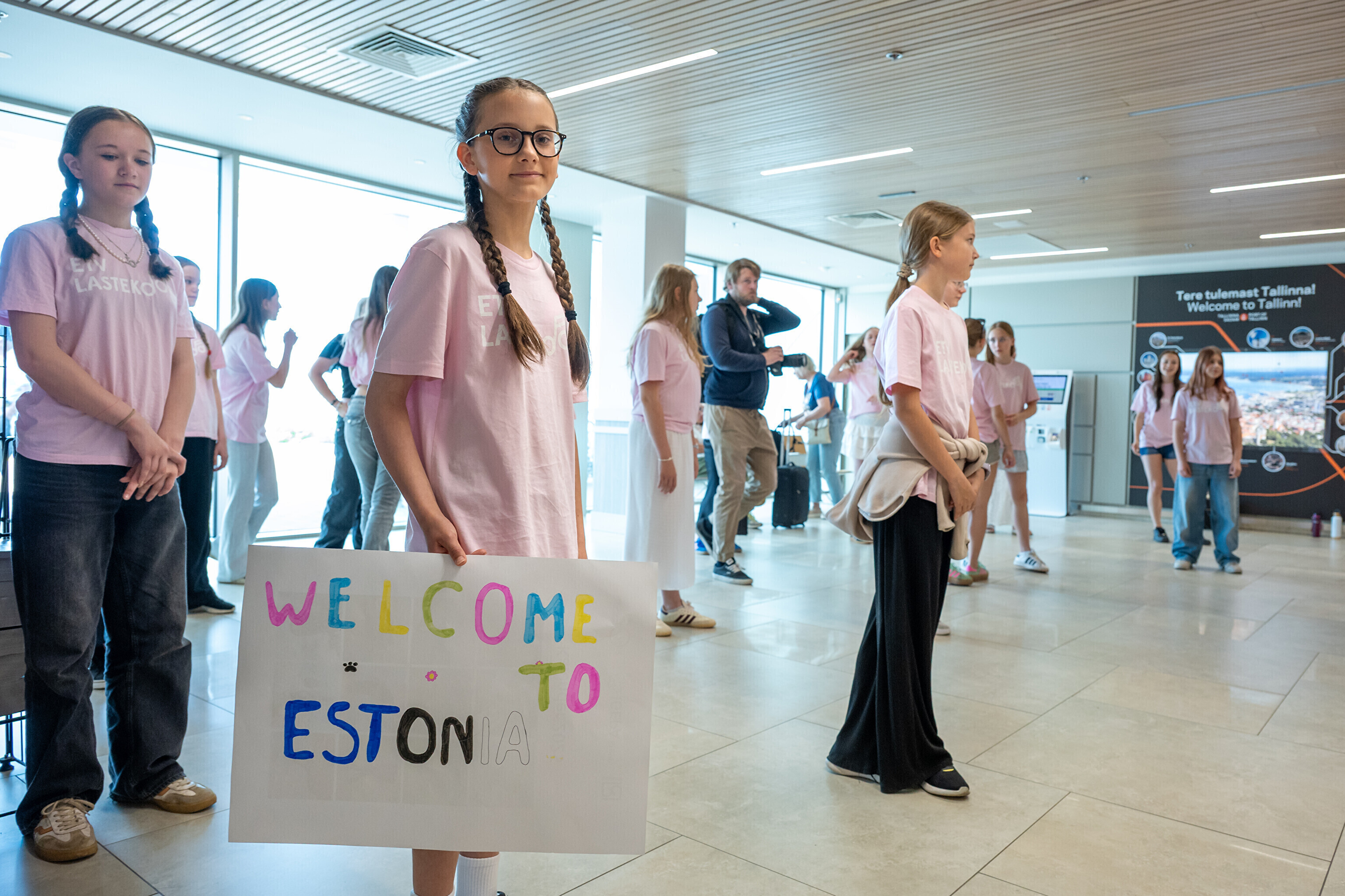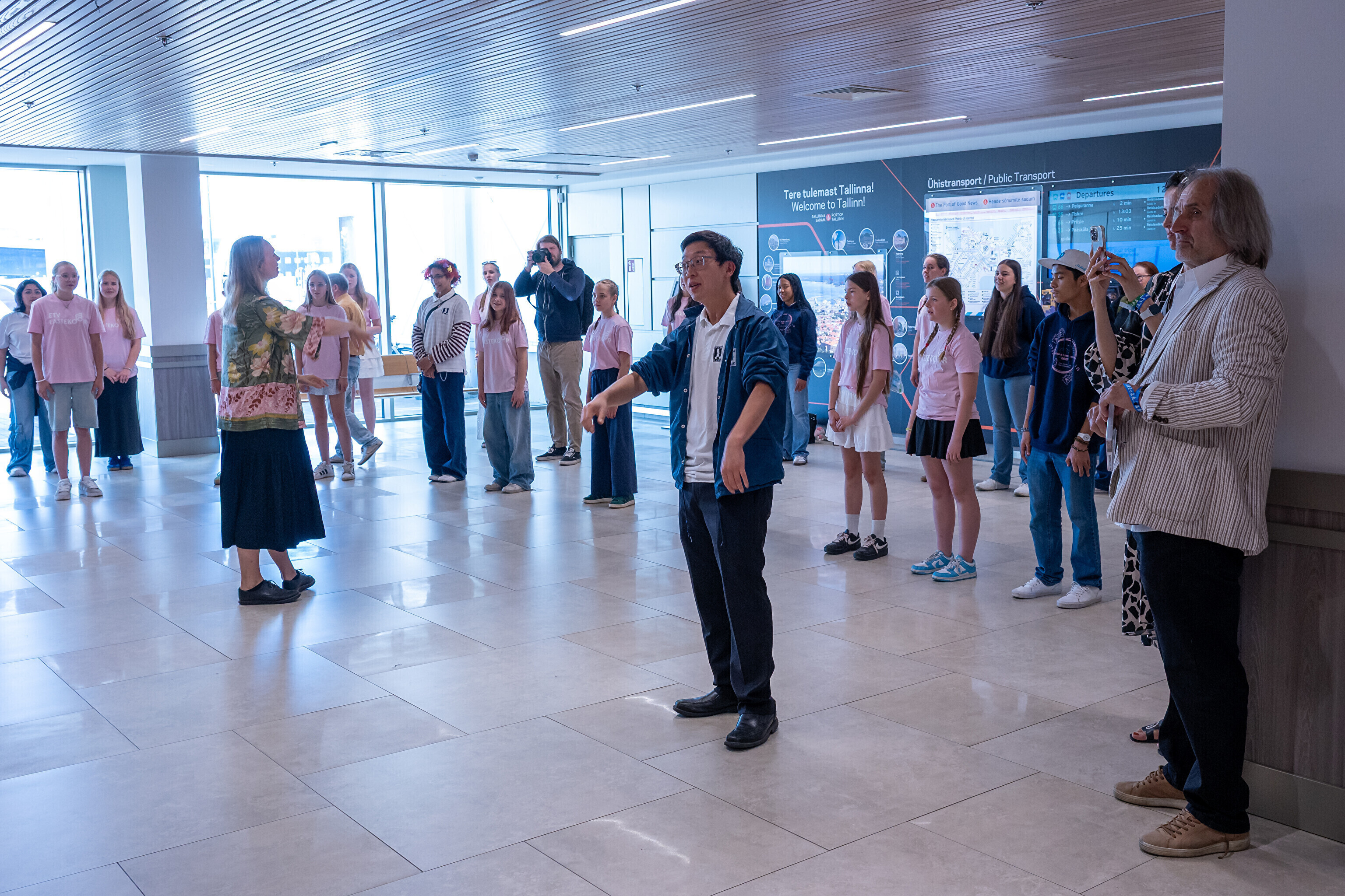 USA koori võtsid sadamaterminalis soojade tervituste ja lauluga vastu dirigent Aarne Saluveer ning ETV mudilas-, laste- ja tütarlastekoorid.
