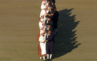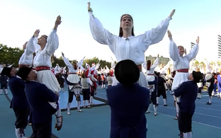Hetkeks matab kogu staadioni vaikus, elev pinge hõljub õhus koos lämmatava palavusega – ja siis hakkabki pihta. Etenduse juhatavad sisse võimlemisrühmad. Sajad värvilistes kostüümides võimlejad võtavad sekunditega tervet staadionit katvaid mustreid. Kostüümide eripäraks on erinevat värvi seelikud, mis seotakse õlgadelt lahti, et kogu kostüümi värvi vahetada. Nii on alguses kollastes toonides alustanud võimlejad lõpuks sinised, roosad, rohelised.