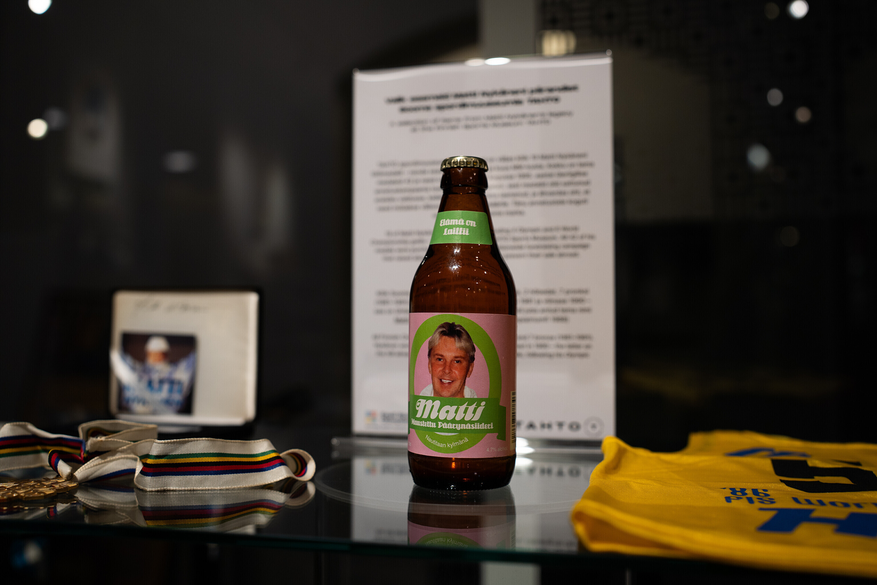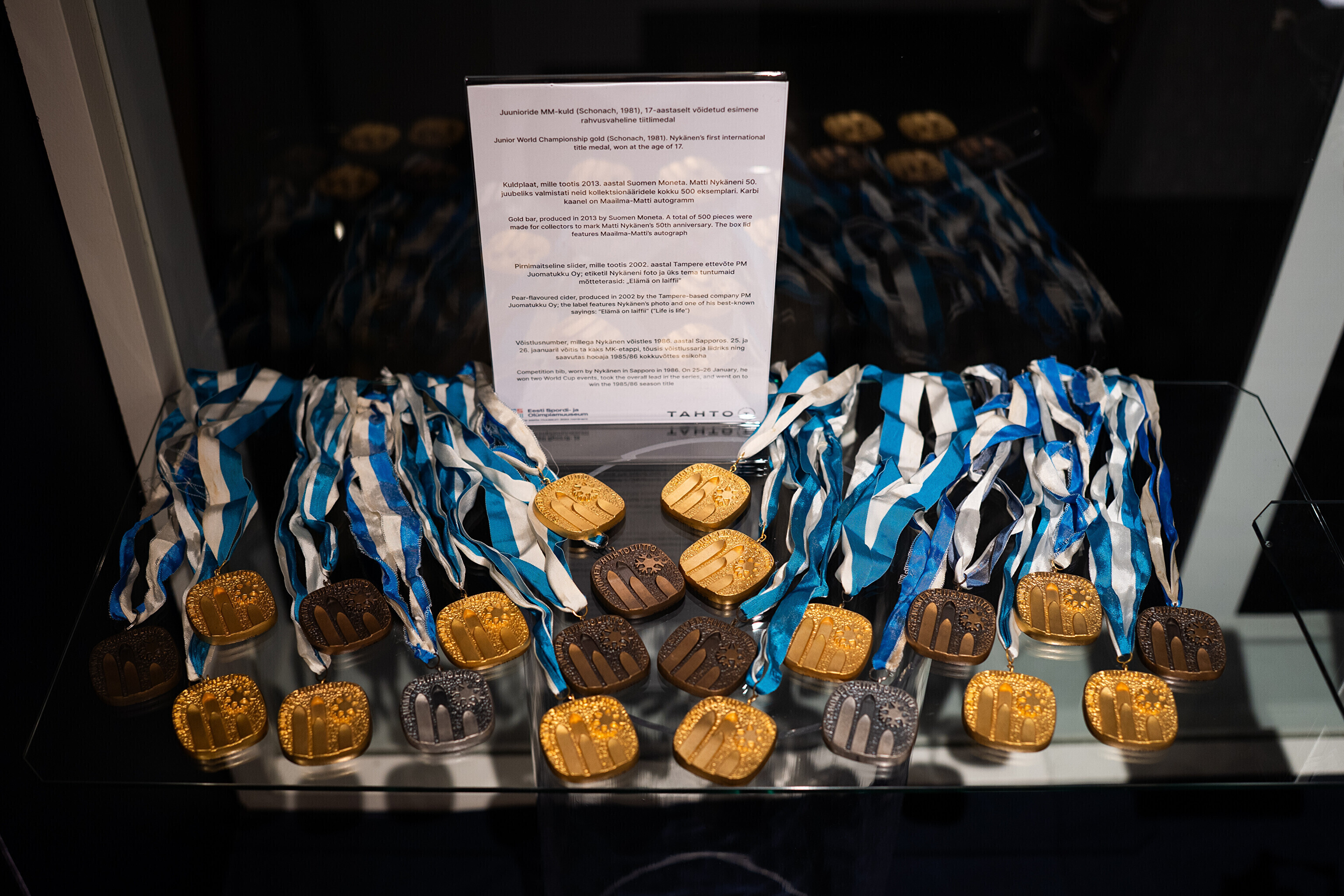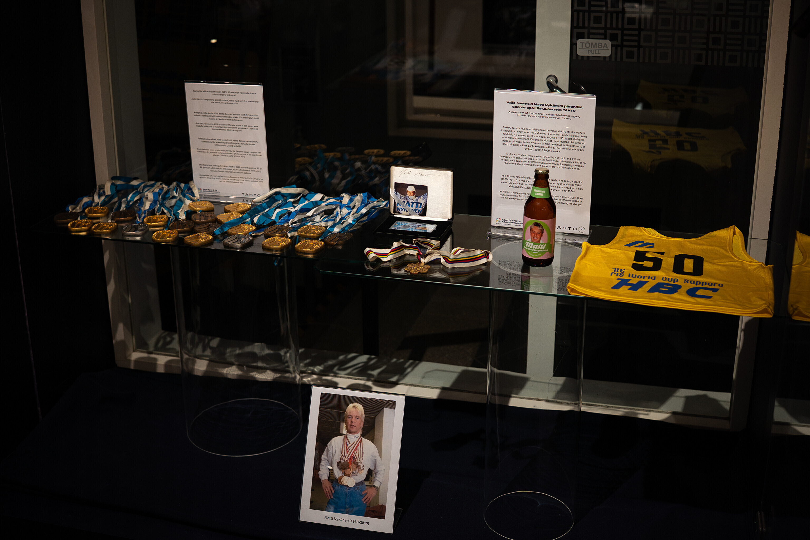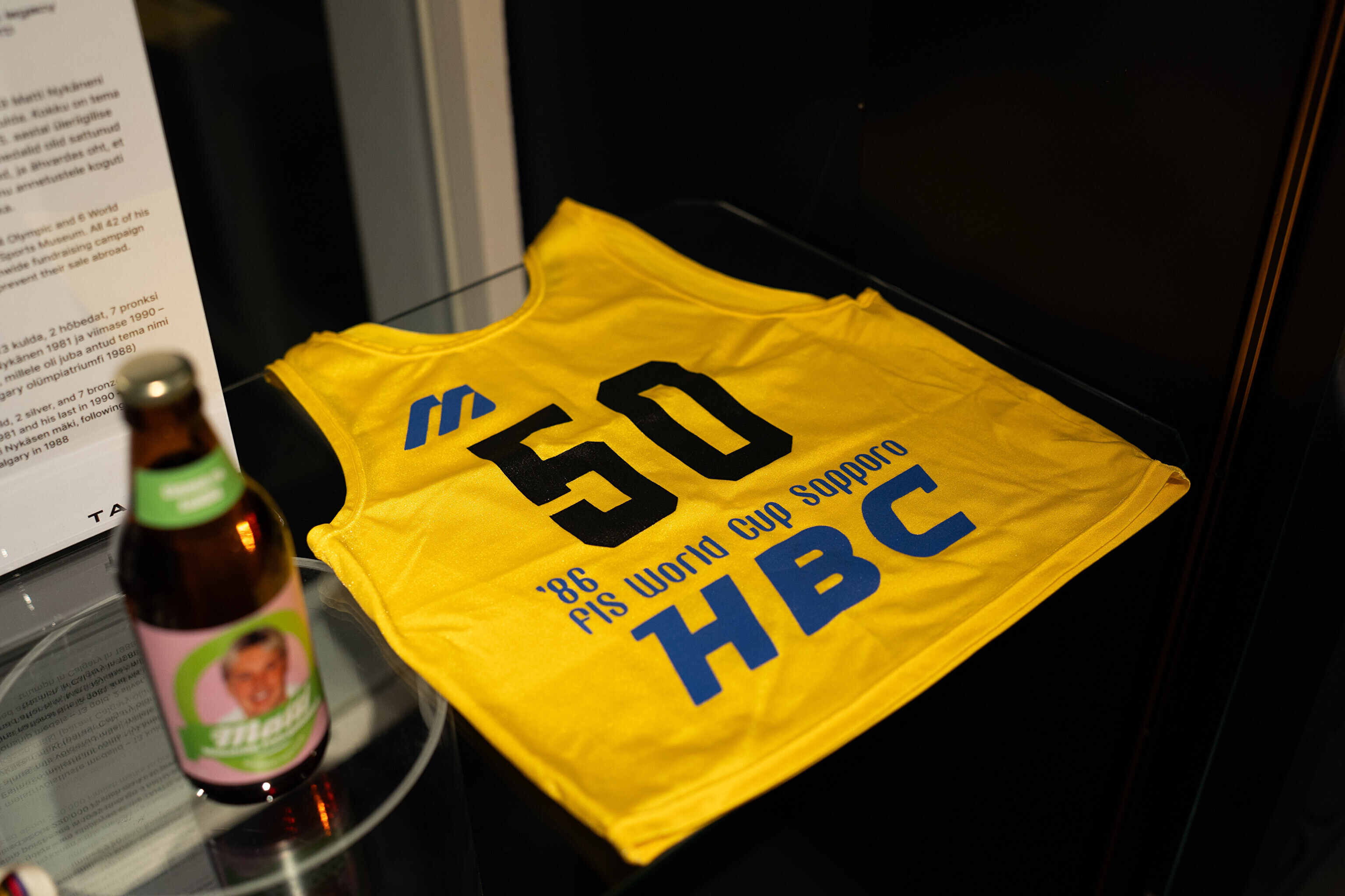 Väljapanekul näeb veel 1986. aastal Sapporos sportlasel seljas olnud MK-sarja liidrisärki, Nykäneni pildiga kuldplaati ning siidripudelit.