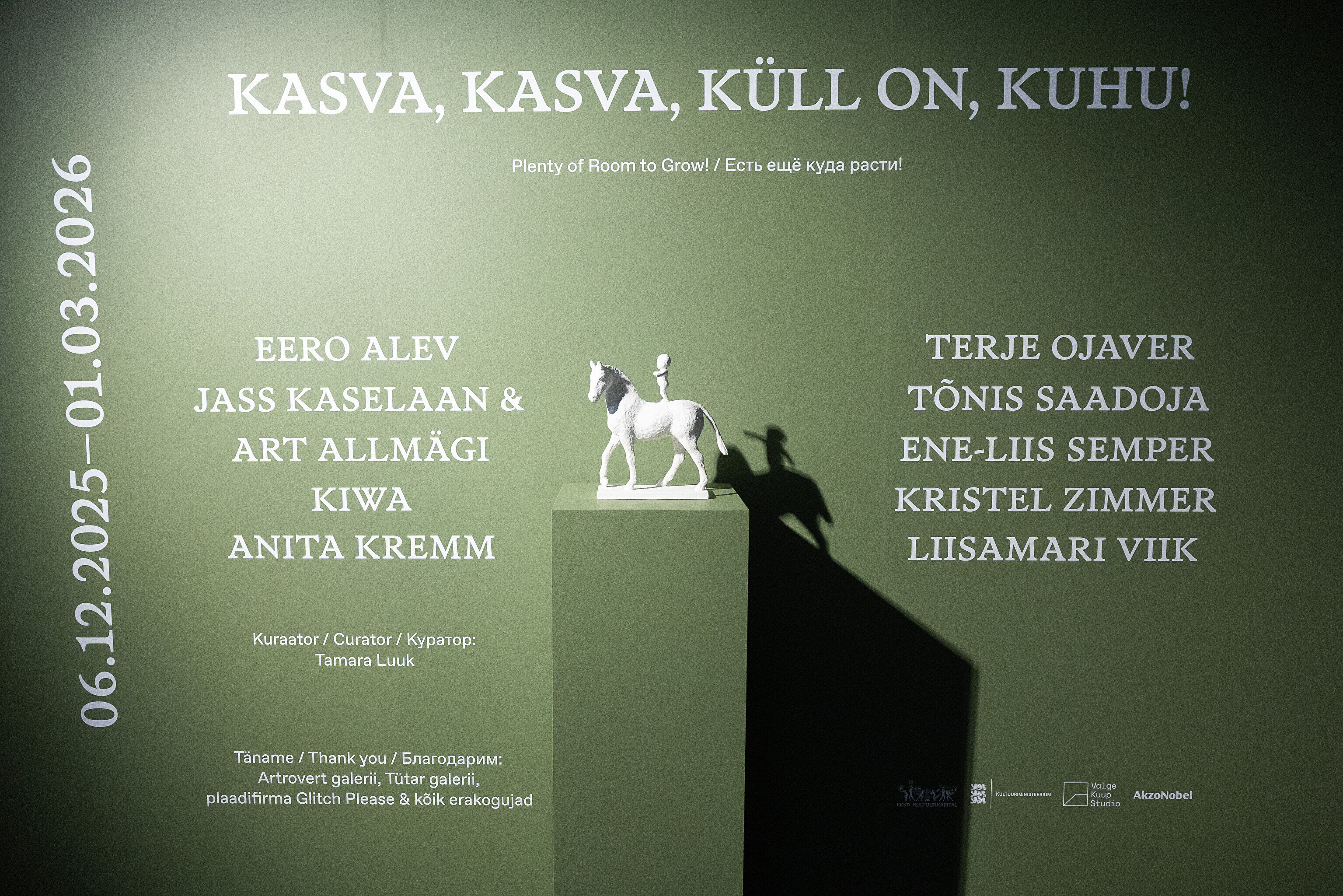 Näituse projektijuht Hanna-Antheia Stern, kujundaja ja installaator Valge Kuup, graafiline disainer Henri Kutsar.