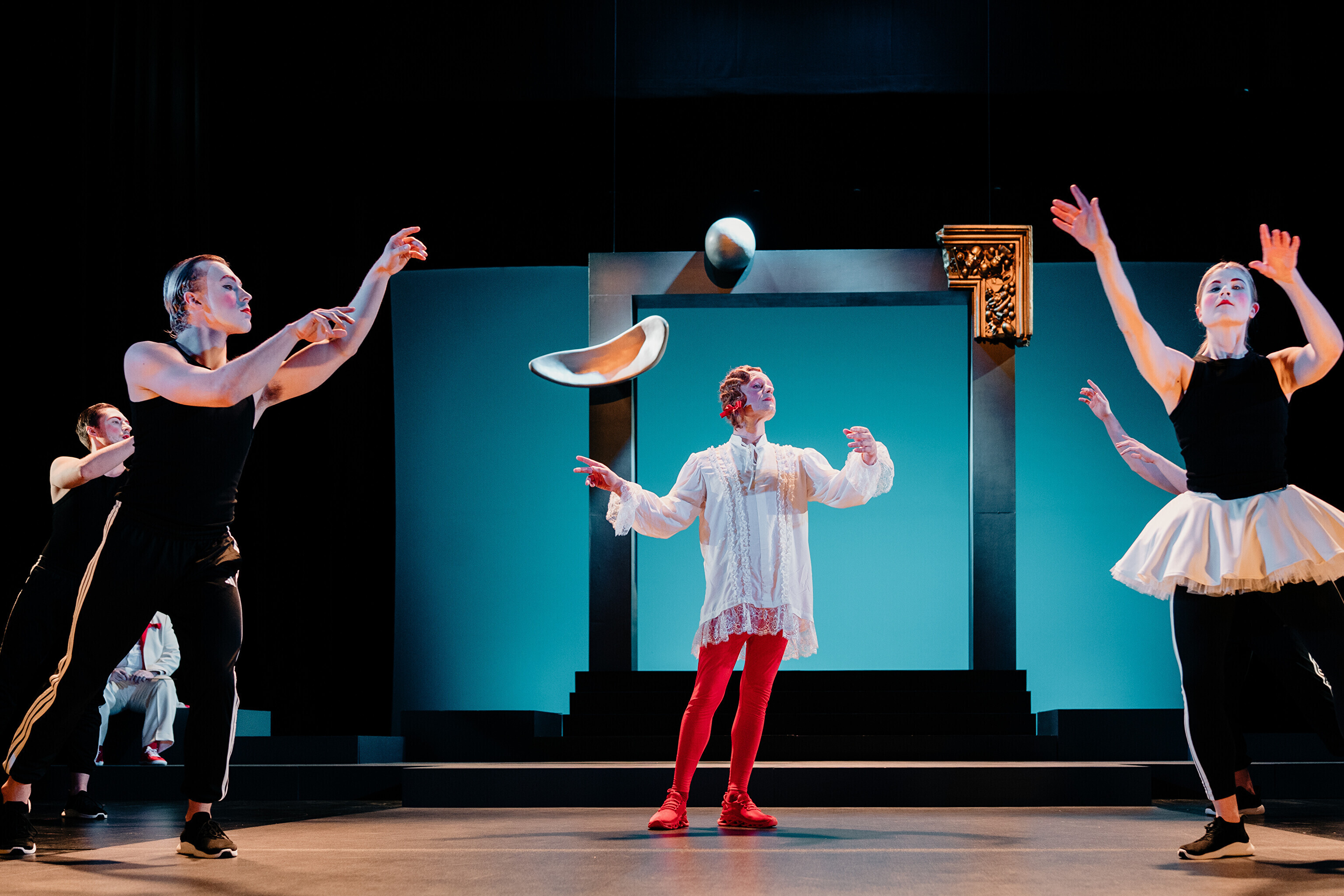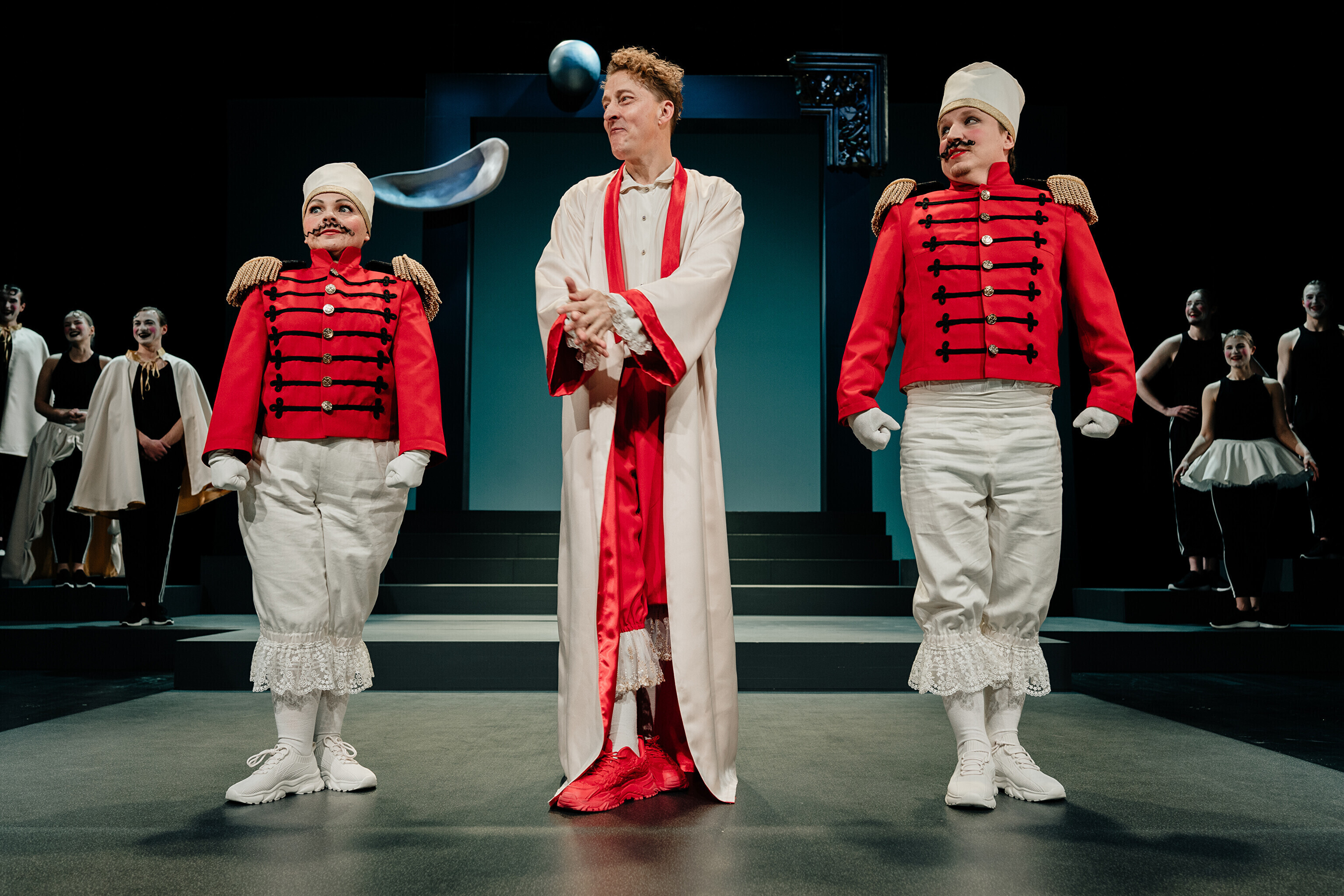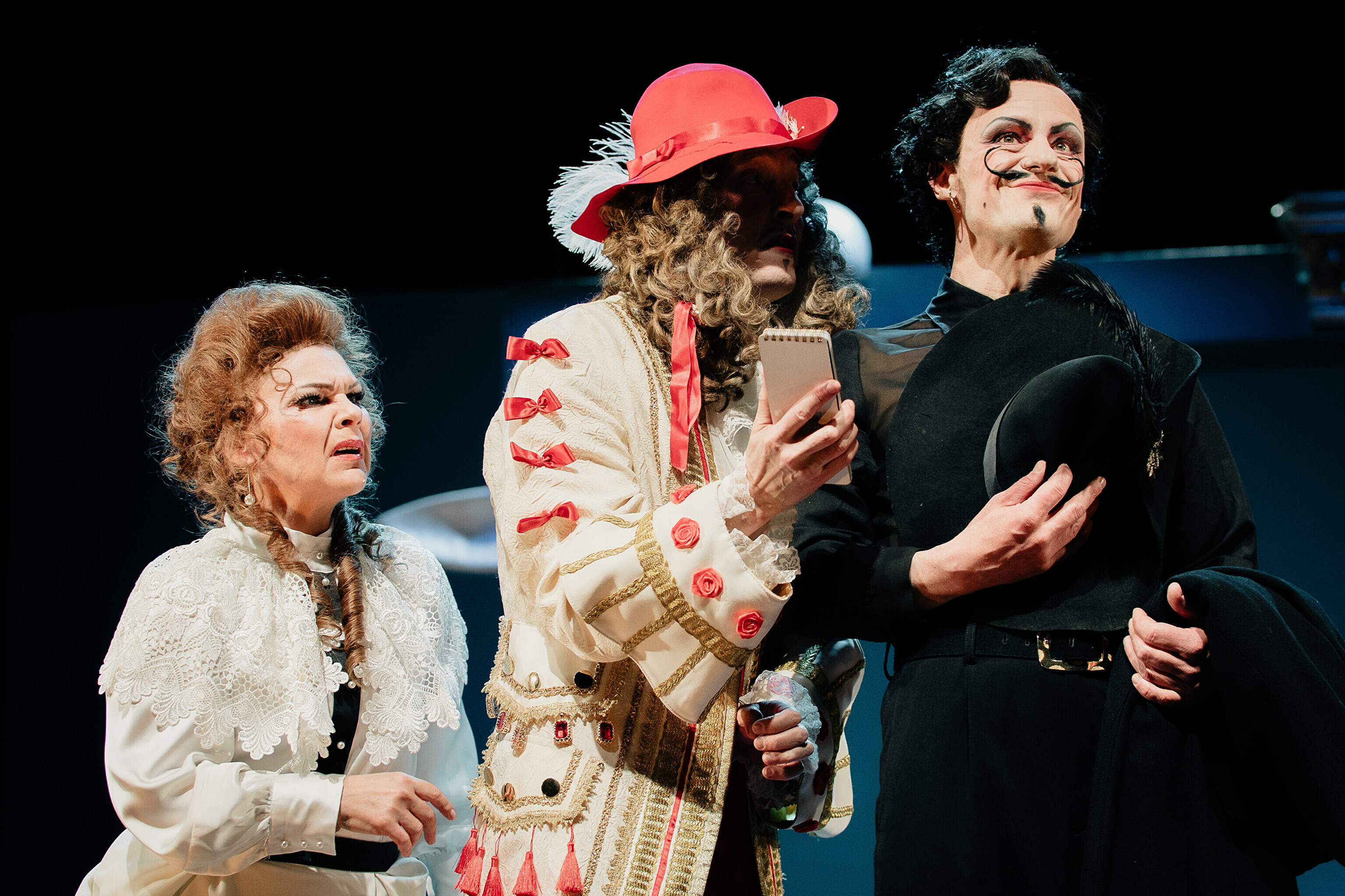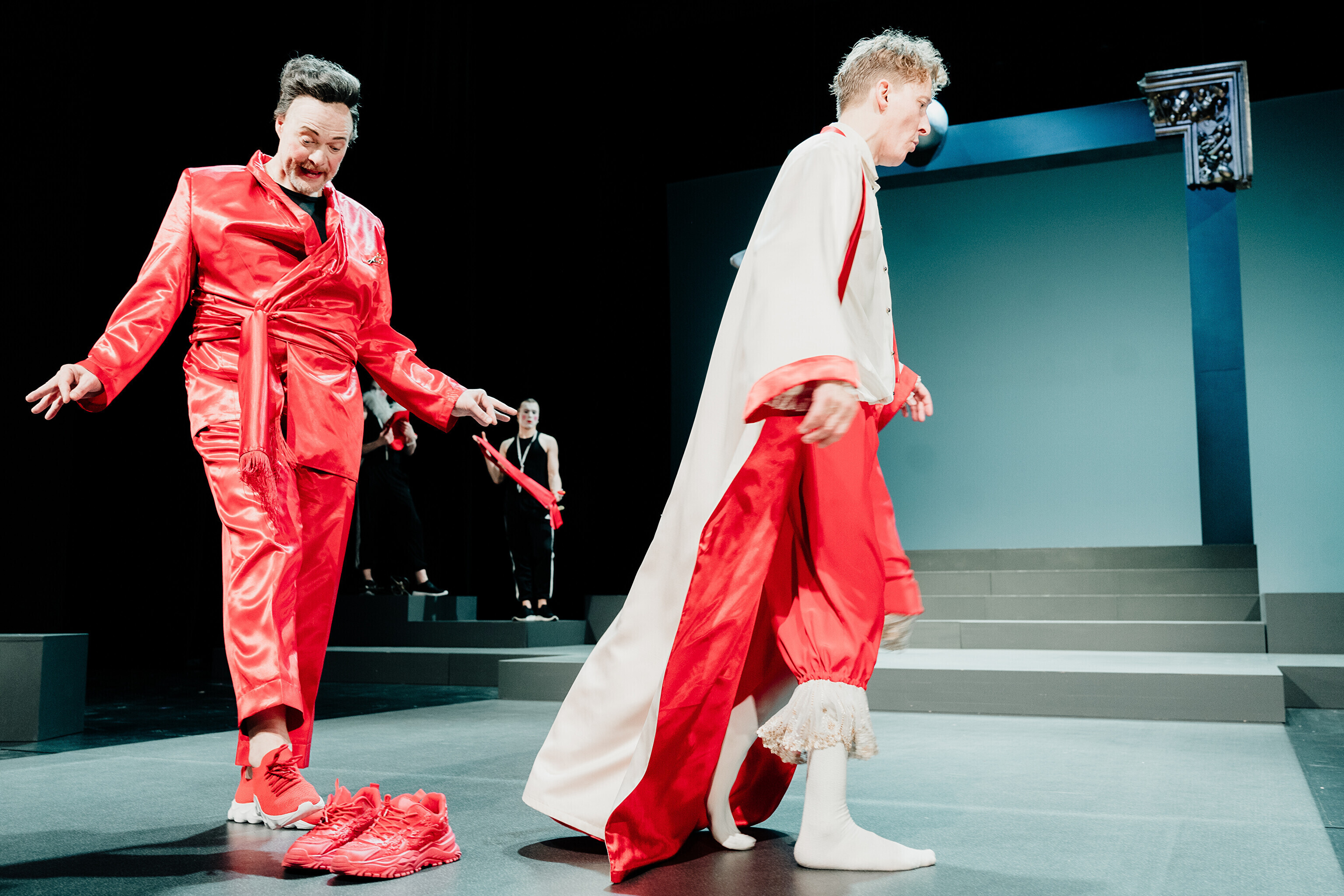 Lavastuses mängivad Margaret Sarv, Merlin Kivi, Jaana Kena, Adeele Jaago, Aarne Soro, Jass Kalev Mäe, Alden Kirss, Tarvo Vridolin, Janek Vadi, Riho Kütsar ja Vallo Kirs ning külalistena TÜ VKA teatrikunsti 16. lennust Leonhard Sass Taalmaa, Saara Kaljujärv, Jens-Patrik Rand ja Jenss Lootus.
