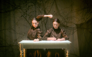 Kaks lakooniliselt pruunidesse pikkadesse kleitidesse riietatud sarnaste soengutega daami võtavad minimalistlikult ja kargelt kujundatud laval poose. Enamasti on nad kõrvuti (armastajad või lähedased vaatavad paralleelselt, mitte teinteisele otsa), harva on kehalises kontaktis. Enamasti kestab misanstseen või tilluke episood sekundeid, mõnikümmend sekundit, harva minuti, kuigi on ka pikka vaikset staatikat – ja siis tuleb blackout, millele järgneb uus minimalistlik stseen. Kogu tükk algab pika staatikaga, mis lõppeb pauguga. Veenev pauk. Algul ootasin, millal rääkima hakatakse, kuni tasapisi kohale jõudis, et siin juttu ei tulegi. Nigu oleks lugu tehtud noore Edmuntas Nekroshiuse mälestuseks, see mees armastas ka konsentreeritud, sisemisest pingest laetud tegevust vaikuses ("Pirosmani, Pirosmani" näiteks).